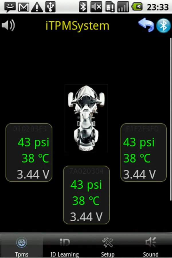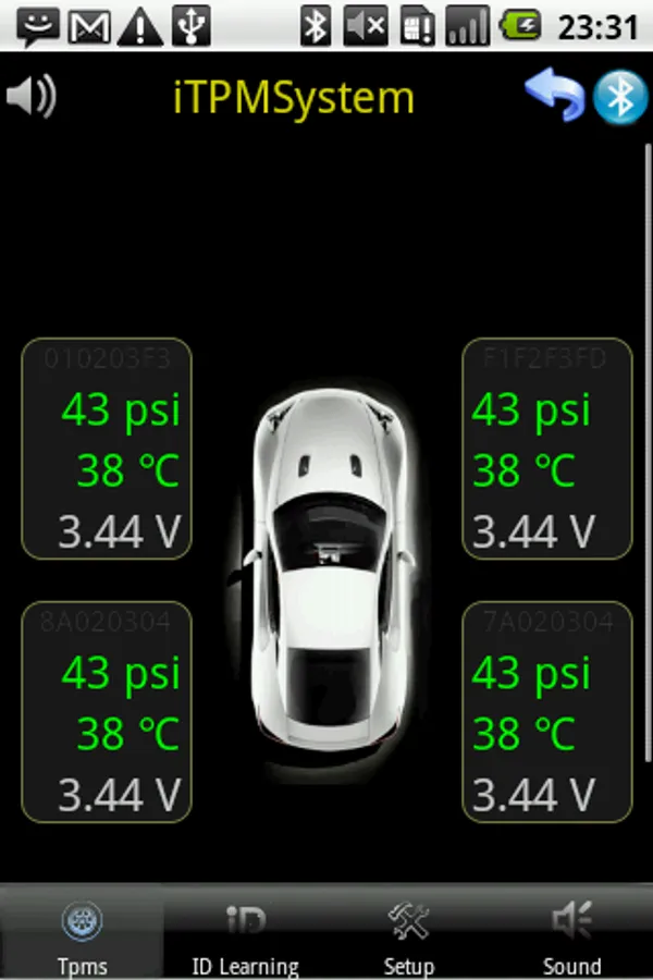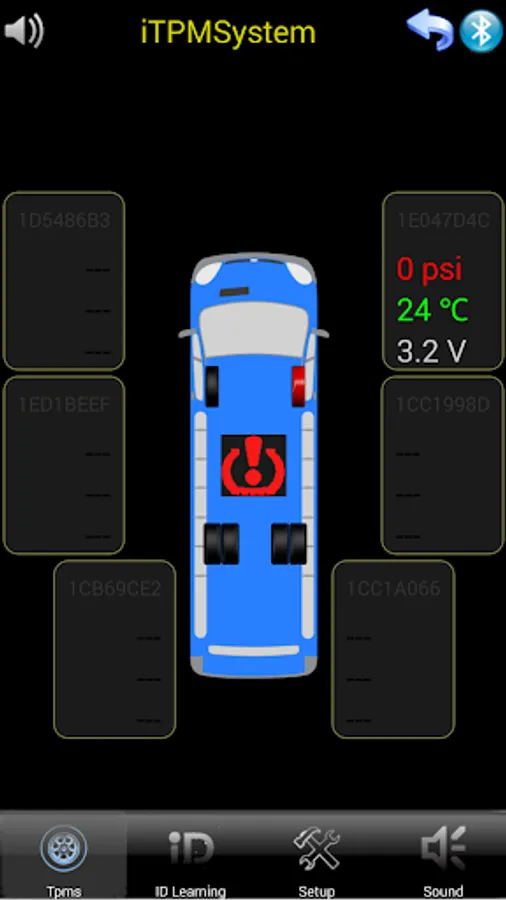 This Tire Pressure Monitoring System(iTPMSystem) was designed for increasing security, reliability, and understanding on tire conditions of your car. Once you properly install the iTPMS, it will automatically monitor pressures and temperatures of tires in real time, the data will be sent to smart phone (android/iPod/iPhone/iPad) through Bluetooth communications. When there is any abnormal pressure (under or over inflated) and/or temperature of tire detected, iPhone, iPod, and iPad will alert driver immediately. This system could ensure you are driving in safety.