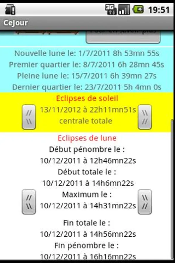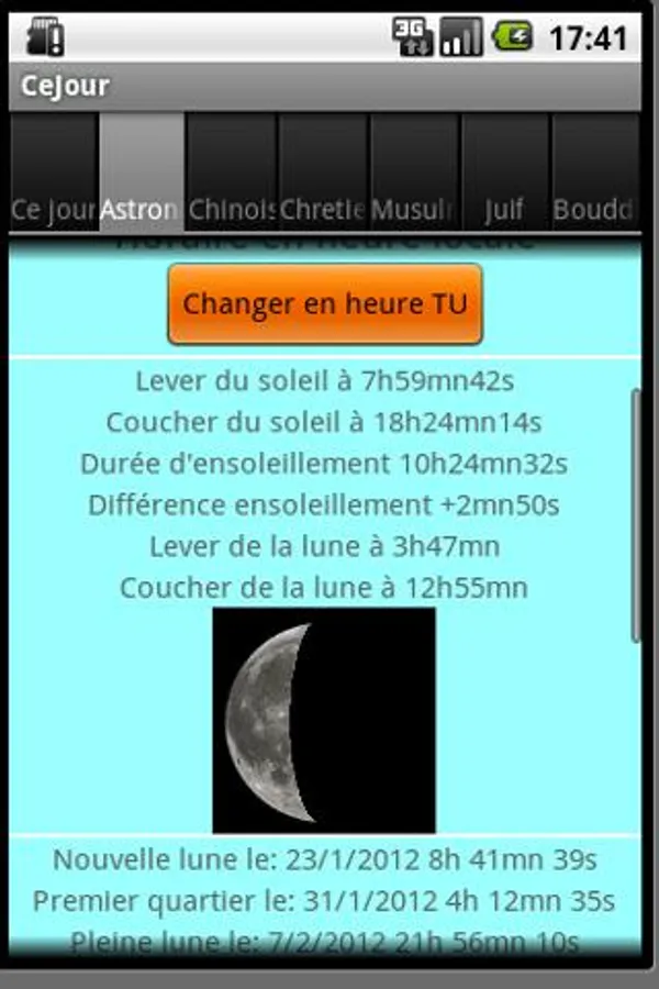 - The time of sunrise and sunset and moon in local and GMT depending on the desired location (parameters)