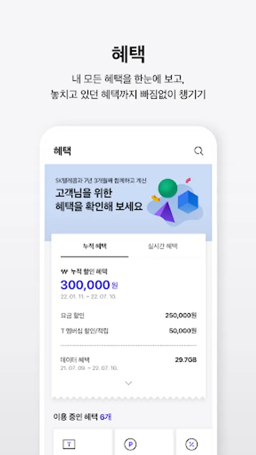 It collects and shows the benefits you have received, and you can check/use various benefits and events provided by SK Telecom.