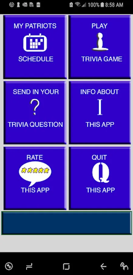 2022-2023 Schedule for Patriots fans and Trivia Game for Patriots football fans. This app has the schedule for wicked die hard Patriots football fans with TV and radio listings as well as a great Patriots Trivia Game. Over 10,000 Patriots fans have downloaded this very fast, small, and free simple app. So when you are walking around Bean Town and someone says “Hey, when do the Patriots play this week?" or "Who do the Patriots play this week?”. One tap of your Android phone and there is the answer! No thumbing through old months, this app knows today's date and quickly shows the next set of games from today's date to the end.