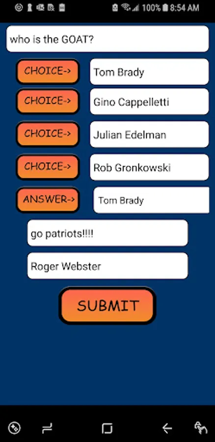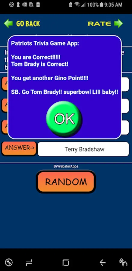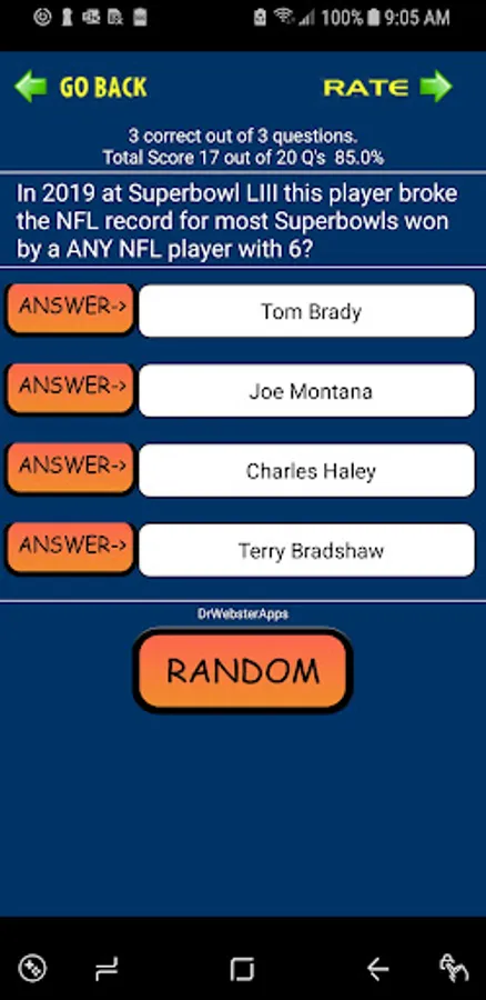 Also, many Patriots fans have downloaded this fun and challenging app that tests your knowledge of important stats and history of this storied franchise! You can also send in your own Pats Trivia question and we will put it in the database with your name on it if you wish. This app has no official affiliation with the New England Patriots of the NFL. Have fun and enjoy!!!!!