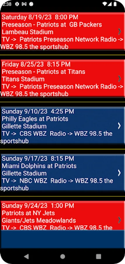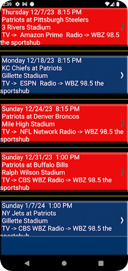 If you keep this app on your phone it will also automatically update next year’s schedule when it is available, so be sure to check Automatic Updates to keep it updated! One tap on any game it takes you to Patriots web site for scores, highlights, blogs, and all the details.