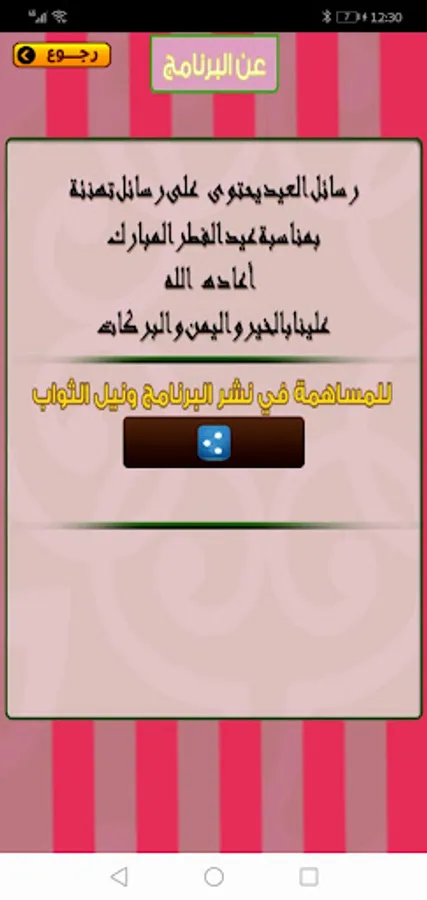مع حلول العيد حيث البهجة والفرحة يهانىء الناس بعضهم البعض اليكم هذا البرنامج لتبادل الرسائل والتهانى بمناسبة قدوم العيد أعادة الله علينا وعلى الأمة الاسلامية بالخير واليمن البركات
