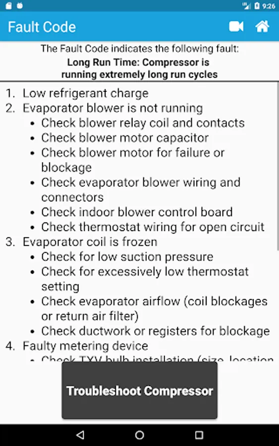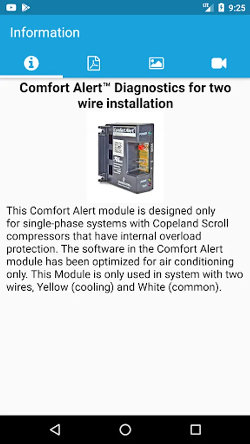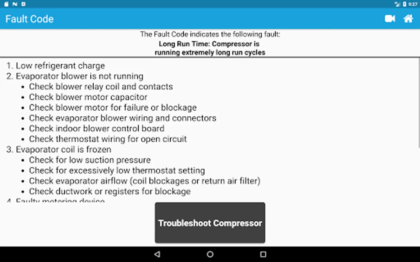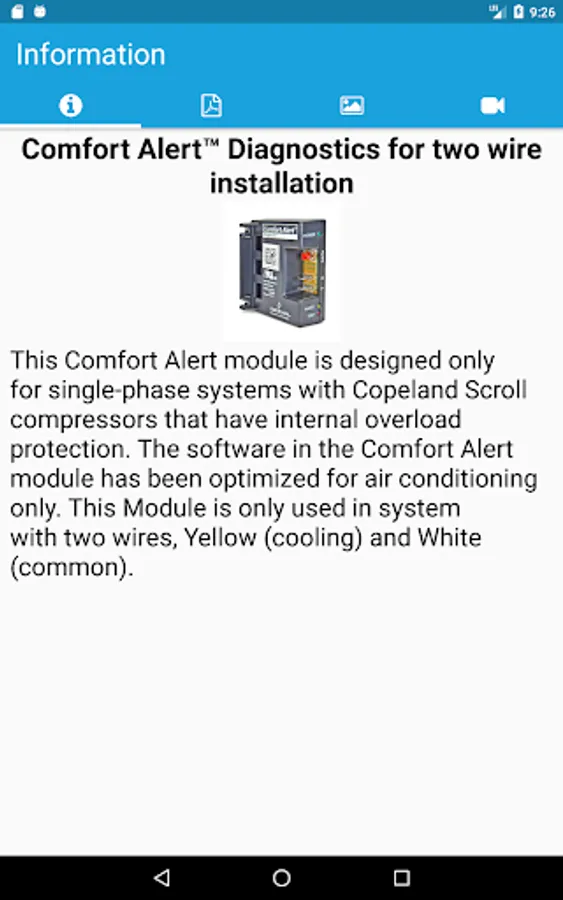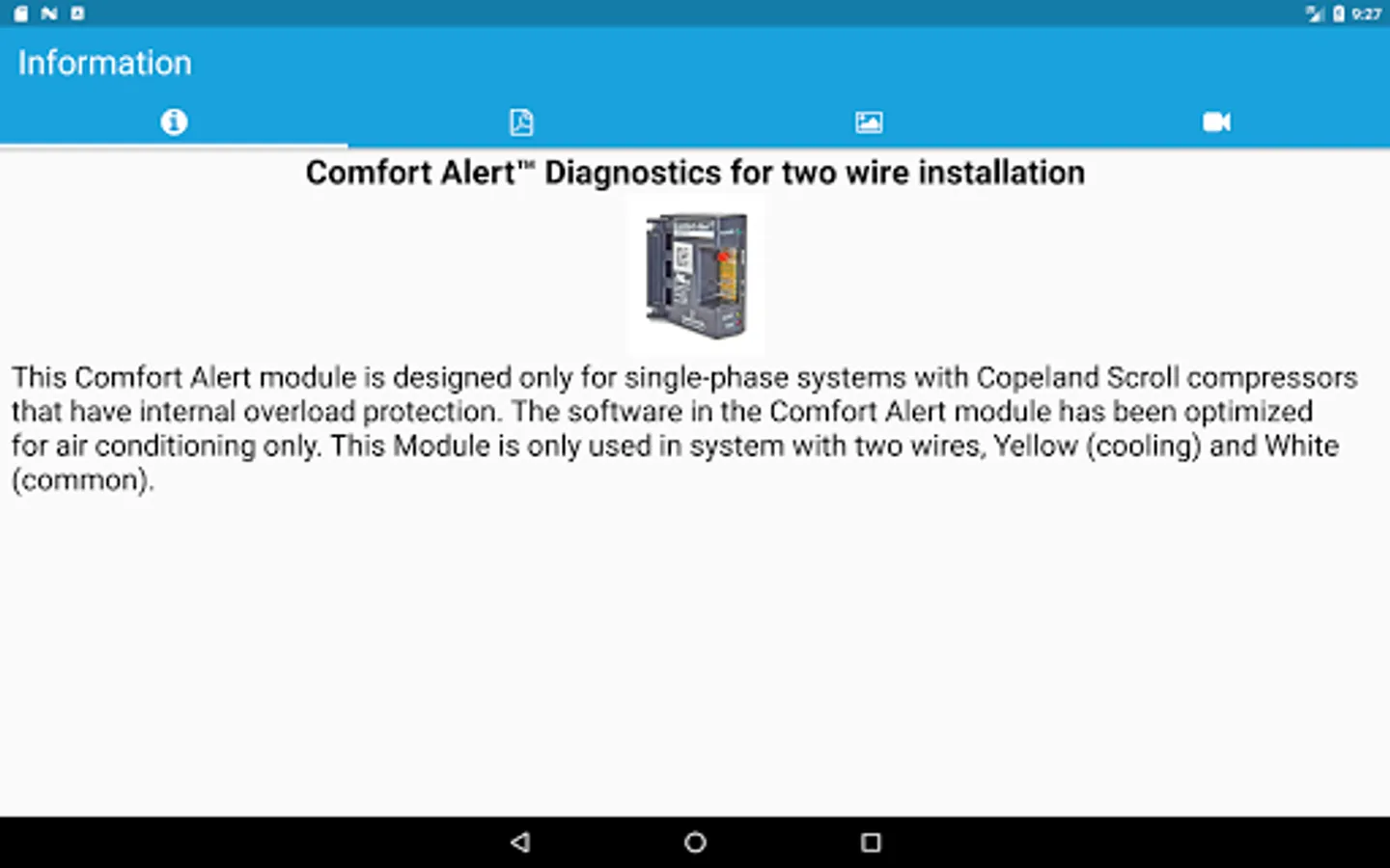 This app allows contractors to easily access compressor electronics product specifications along with the ability to interface with and diagnose the system. Contractors can choose to enter the flashing “alert” code from the electronics module or use a tap feature to help identify the code. Entering the code, gains them access to troubleshooting “tips and tricks” as well as an interactive flow chart to aid in diagnosing system problems.