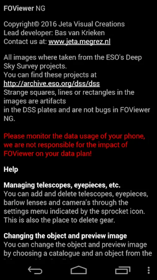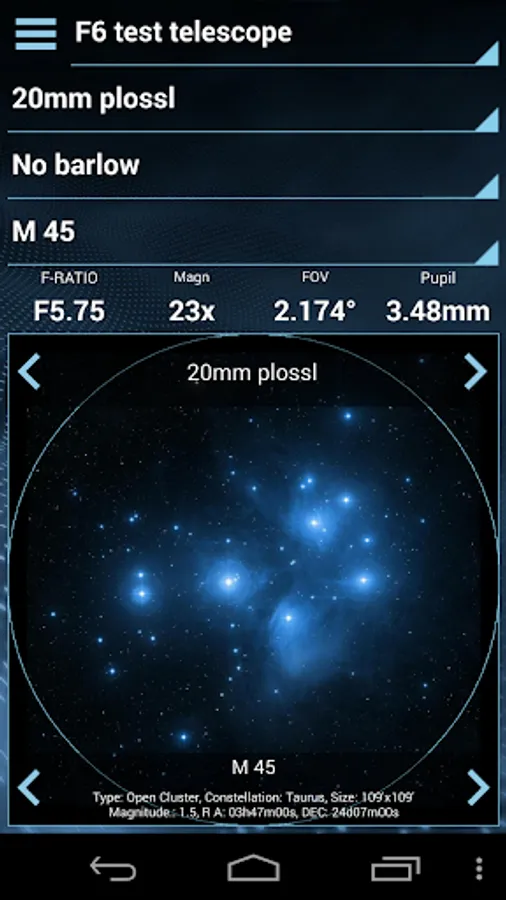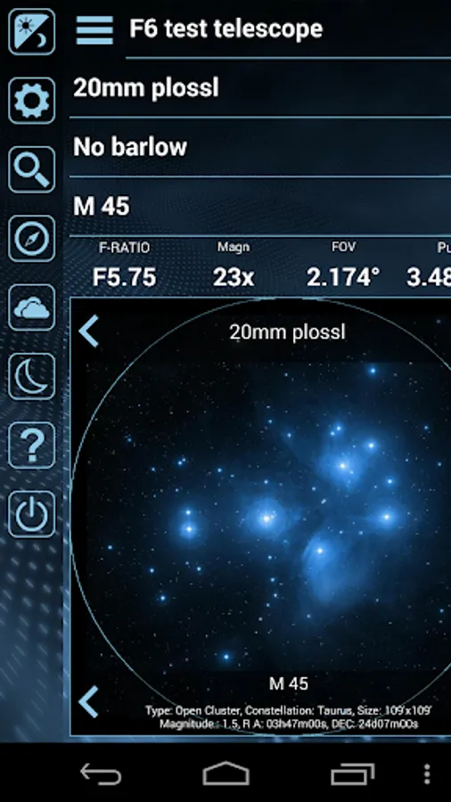FOViewer NG is a handy astronomy tool for every stargazer or astrophotographer. It allows you to calculate things like the magnification of your particular telescope and eyepiece combination. FOViewer NG will also show your field of view superimposed on astrophotos of well-known objects. That way you can get a good prediction of which eyepieces to use to optimally view your celestial targets. You can add your own equipment to FOViewer NG to get spot-on predictions for your telescope / eyepiece combinations. If a particular telescope / eyepiece combination results in a magnification that goes beyond the maximum useful magnification of your telescope, then FOViewer NG will notify you by giving the magnification a red background and showing an alert. There are also a couple of very handy features for astrophotography!