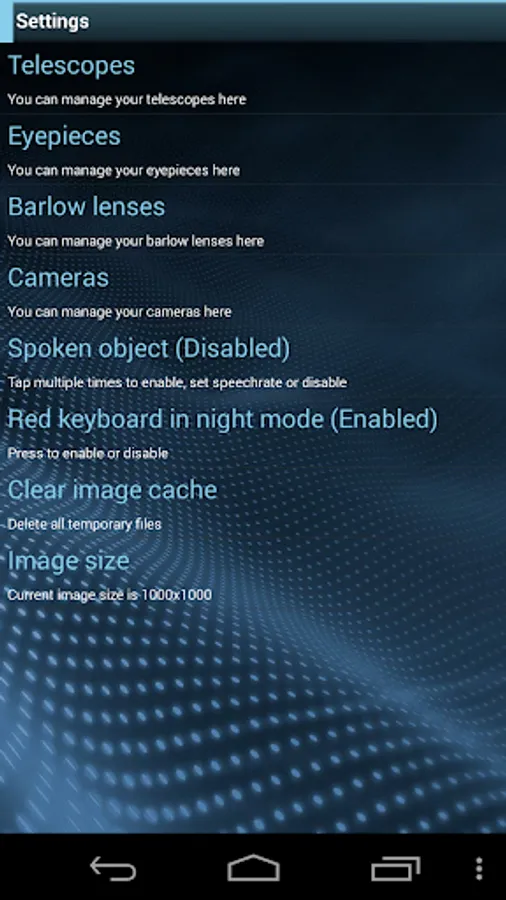 • Let’s you add and remove your own telescopes, eyepieces, CCD camera's and barlow lenses.