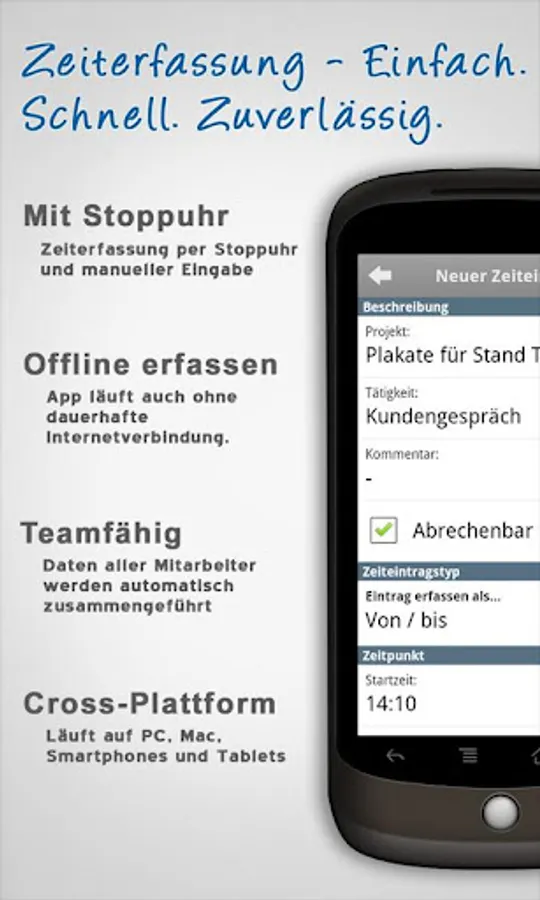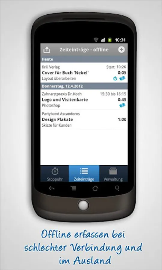 You can record your working hours with a web browser in real-time with the build-in stopwatch or after your work is done with a simple web form. Or if you are on the move you can use a mobile app to capture what you did during your work.