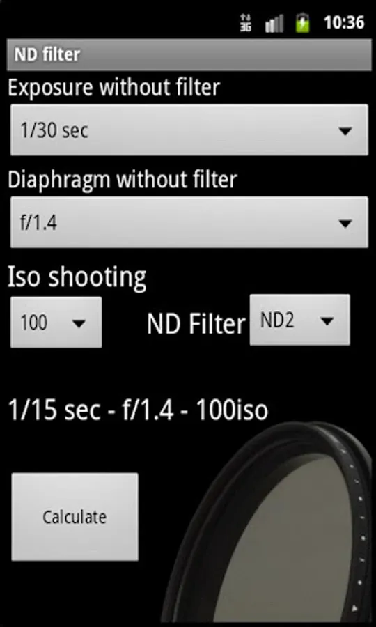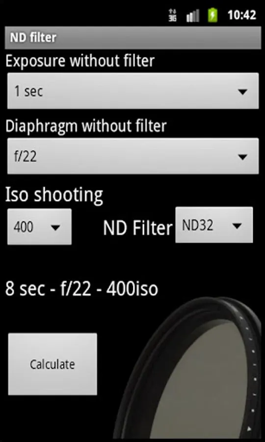 This application calculates the exposure and shutter aperture with ND filter and ISO shooting.In photography, a neutral density filter or ND filter can be a colorless (clear) or grey filter.