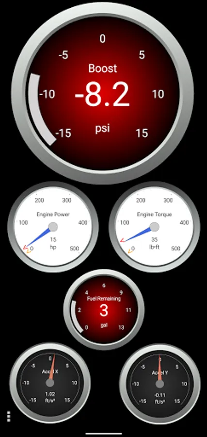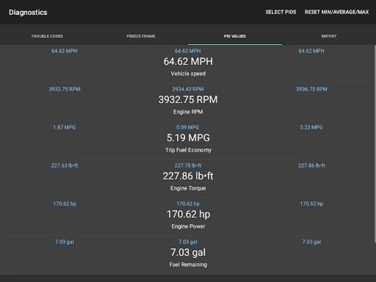 • Display Engine Torque, Engine Power, Turbo Boost pressure, and air-to-fuel (A/F) ratio (vehicle must support the required PIDs)