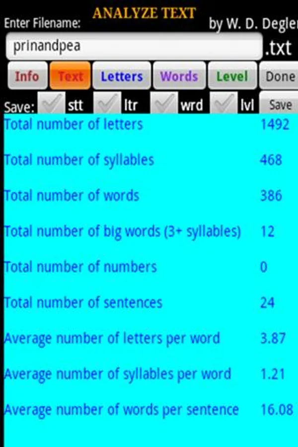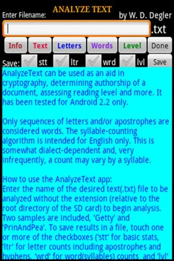 It analyzes frequencies and averages of letters, syllables, words and sentences. Furthermore, it determines reading level according to three popular scales. Any or all of the results can be viewed and/or saved as text files in the root SD card directory or elsewhere. The SD card may be written to or read from but no files are deleted. There are several methods of transferring these text(.txt) files to or from computers or to printers, including use of Dropbox, Cloud Print and other apps. AnalyzeText has been tested on Android 2.2.