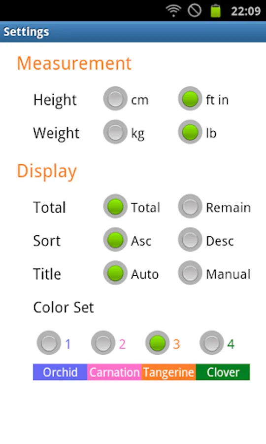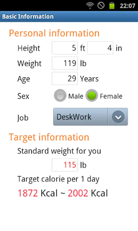 The App will calculates standard weight and target calories per day automatically.