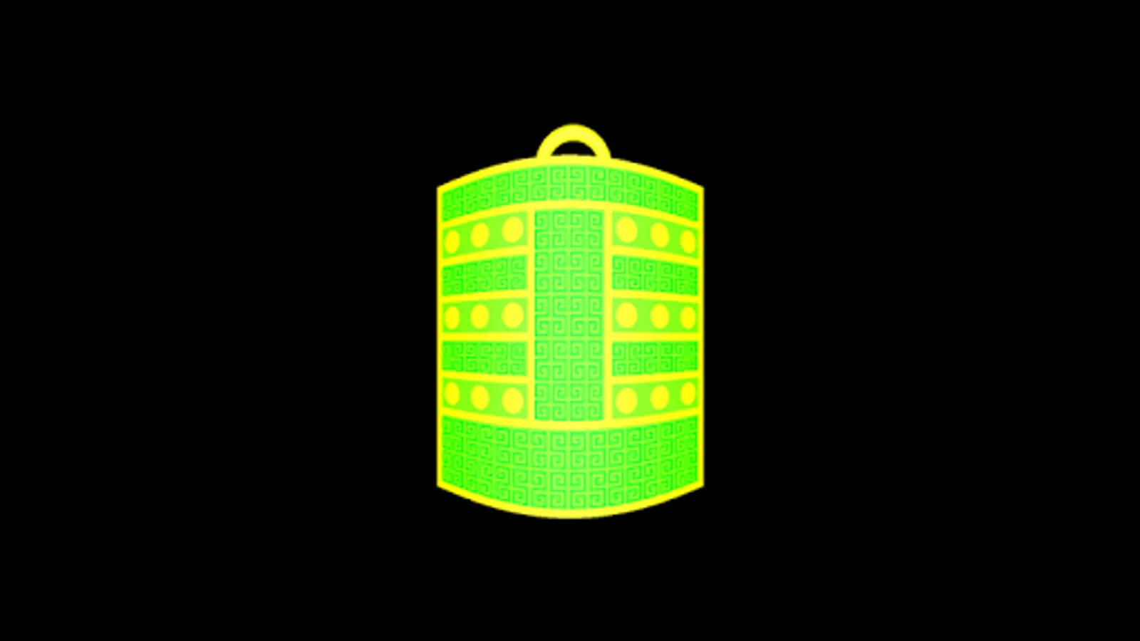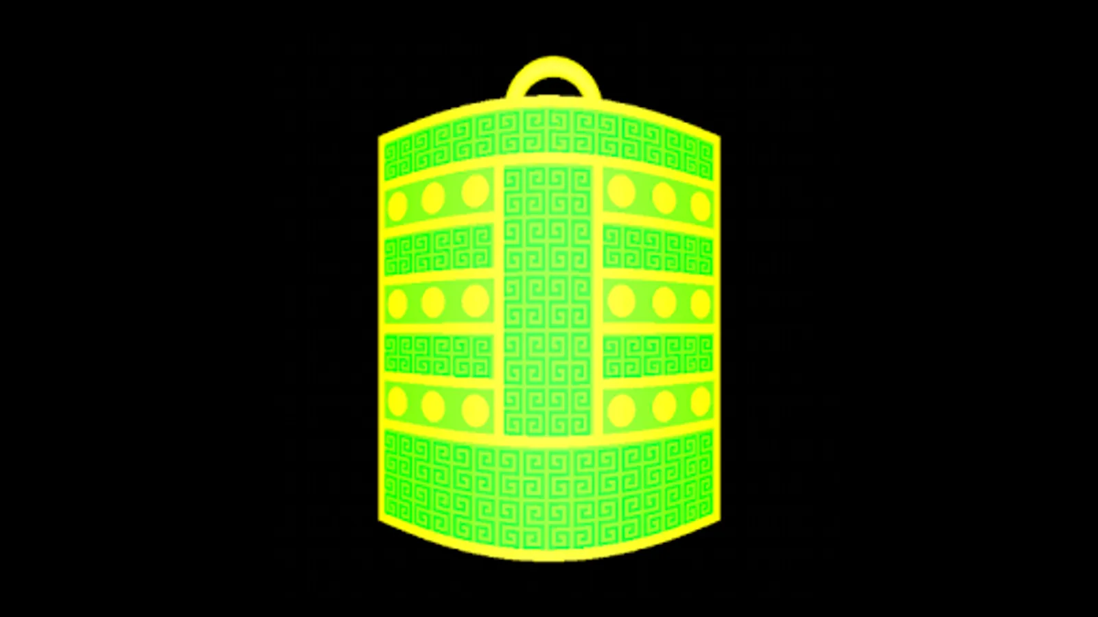 The Bells app depicts a view of striking ancient Chinese two-tone bells surrounded by lattices moving in sync with the string music. Each of the eleven bells have a traditional pattern with a greenish patina that is found on original bronze bells, and each can emit two tones that are 3 semi-tones apart depending on whether they are shown being struck at 0 or a 45 degree angles in the distance, so alltogether they cover the full range of the soundtrack.