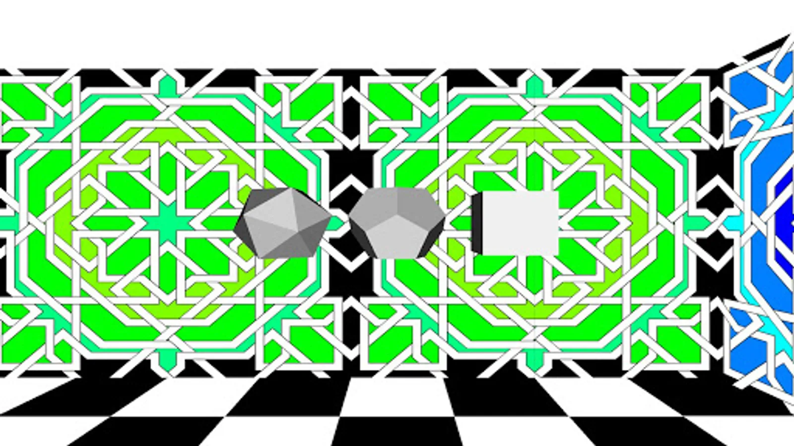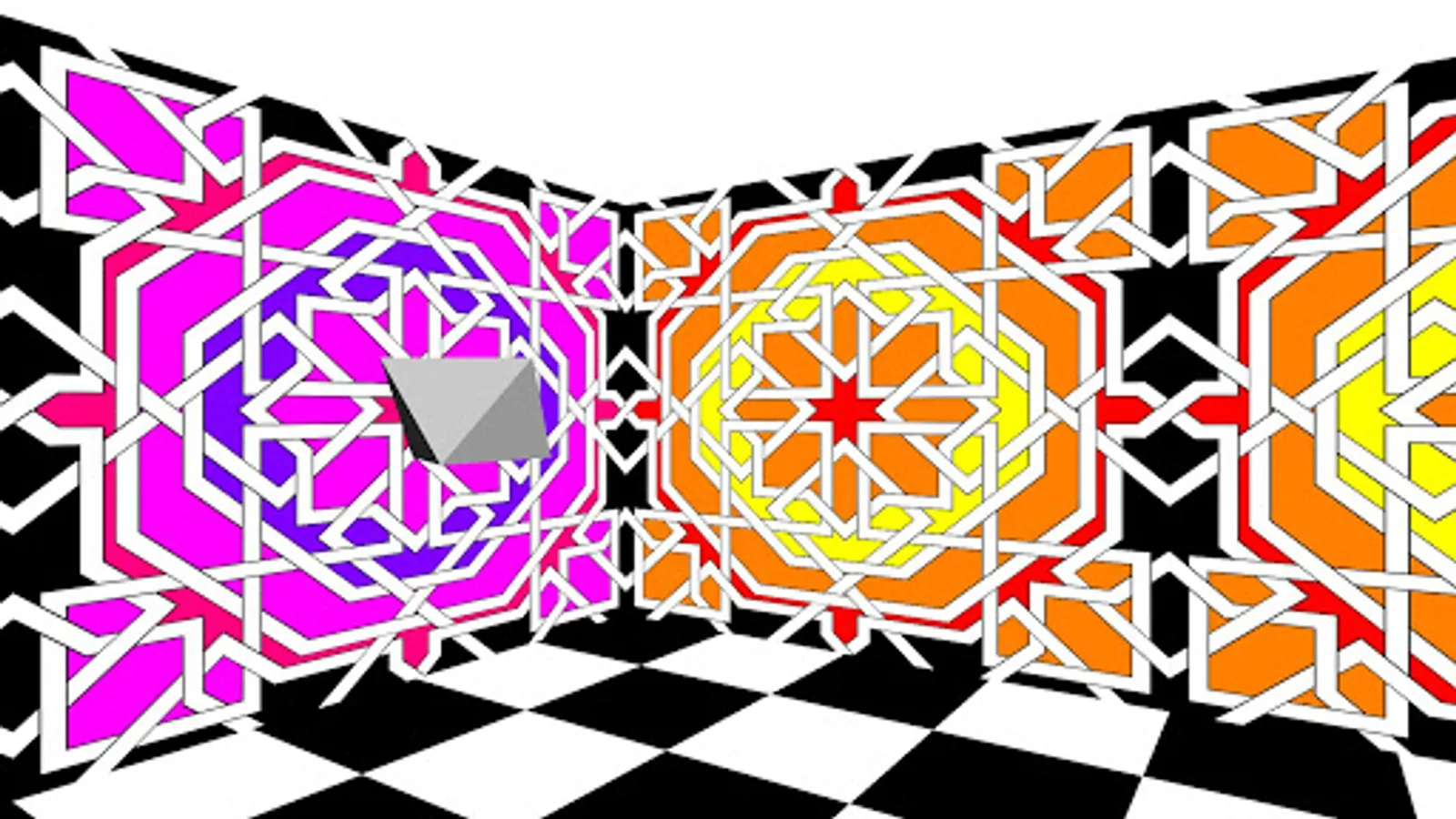 The Textures app is a reconstruction of a French baroque dance based on la Bouree de Basque. The other dancers are represented by the five Platonic Solids. The dance takes place in an room with a checkered floor with Moorish patterns on the walls, each having a different color scheme to assist with orientation. Each repeat in the music allows the viewer and partner Dodecahedron to remain stationary while the other dancers repeat the same movements.