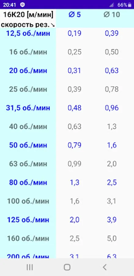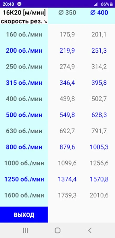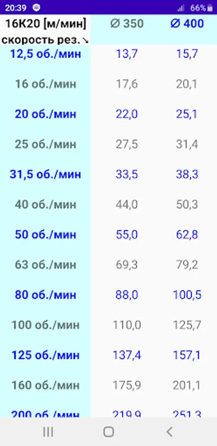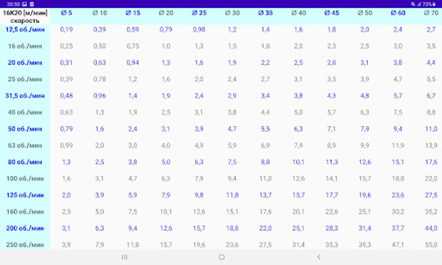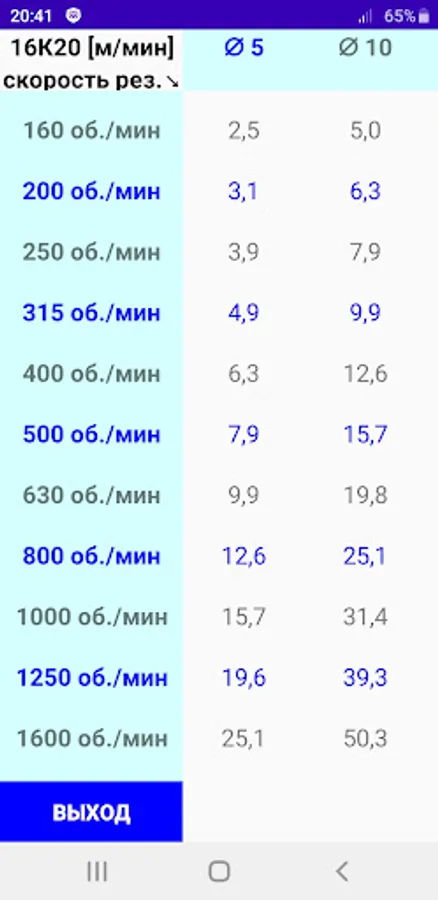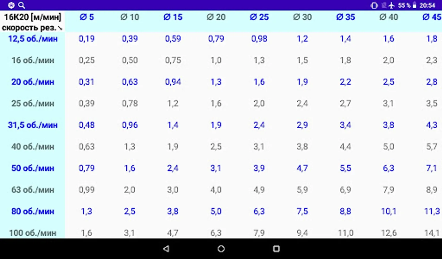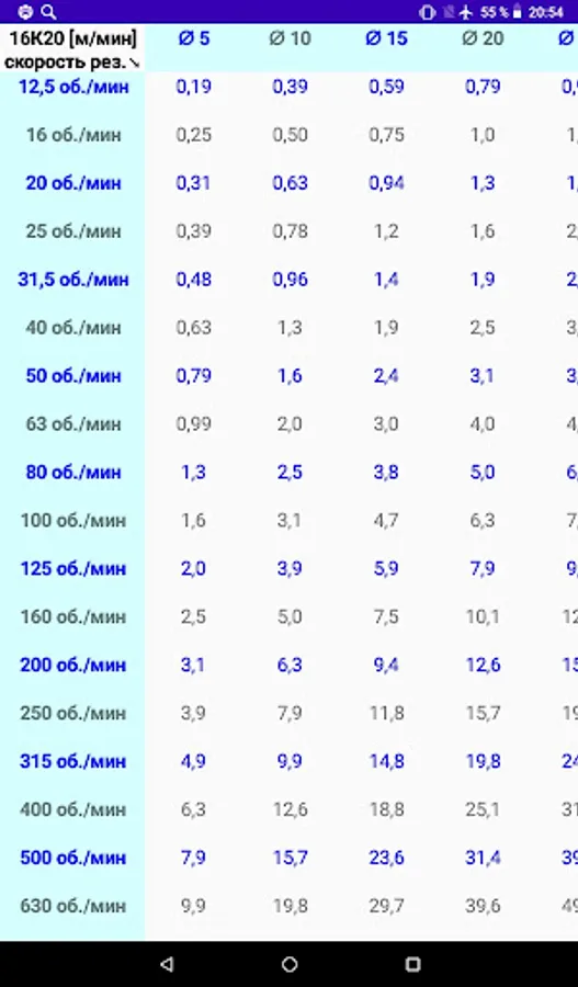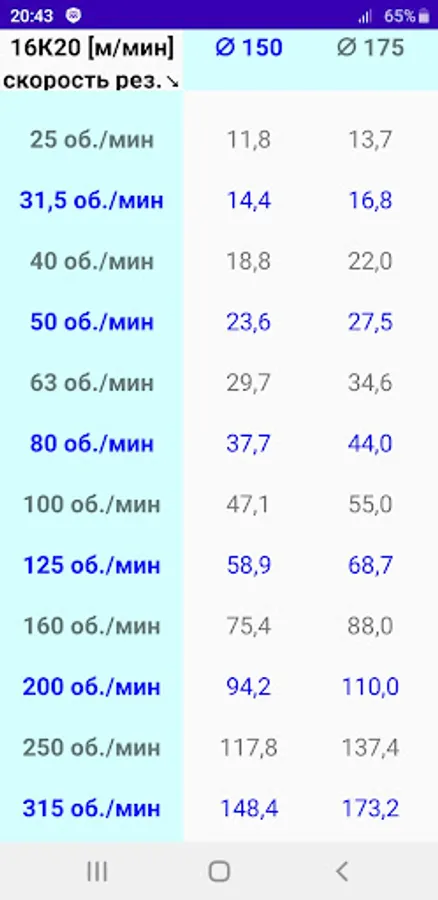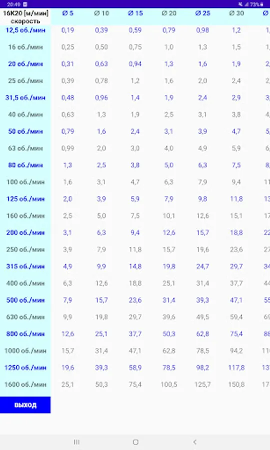 Таблица скоростей резания (от диаметра и оборотов).