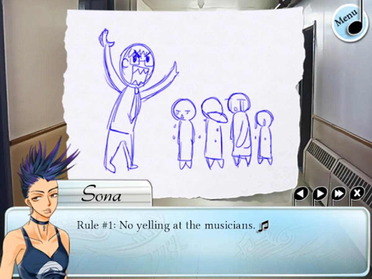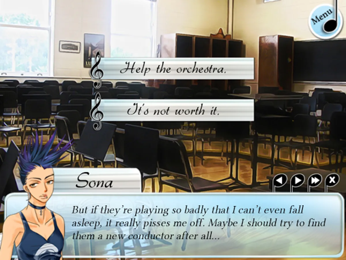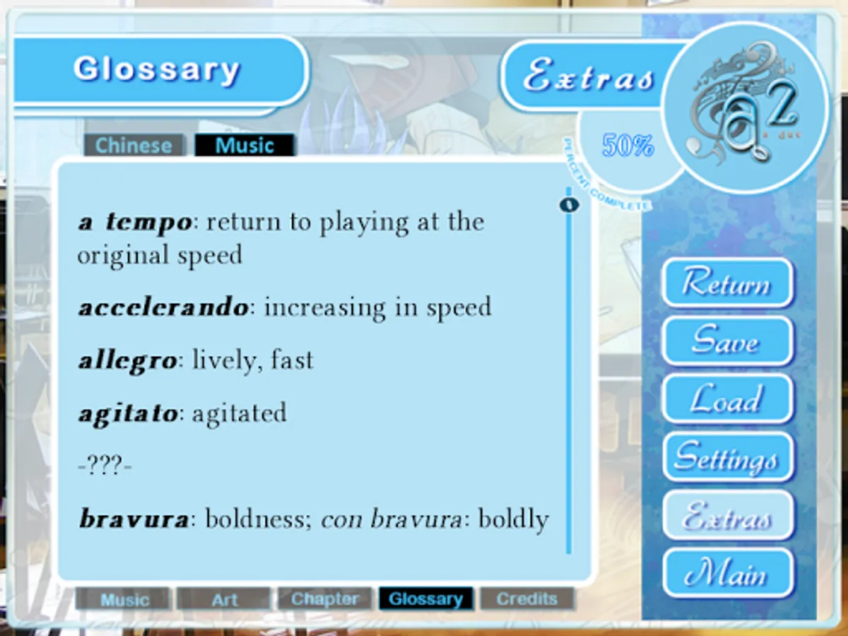 a2 is an ad-free visual novel with romantic comedy and otome game influences. It includes lots of bonus features, including a music/Chinese glossary and a special "translation mode" for all Chinese dialogue (unlocked after reaching all 3 endings or 90% completion).