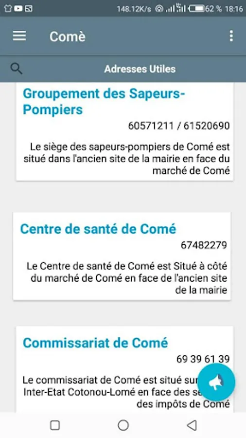In addition, it also informs the citizen about the useful addresses of his commune (Commissariat, Mairie, Hospital, Group of firefighters, etc ...).