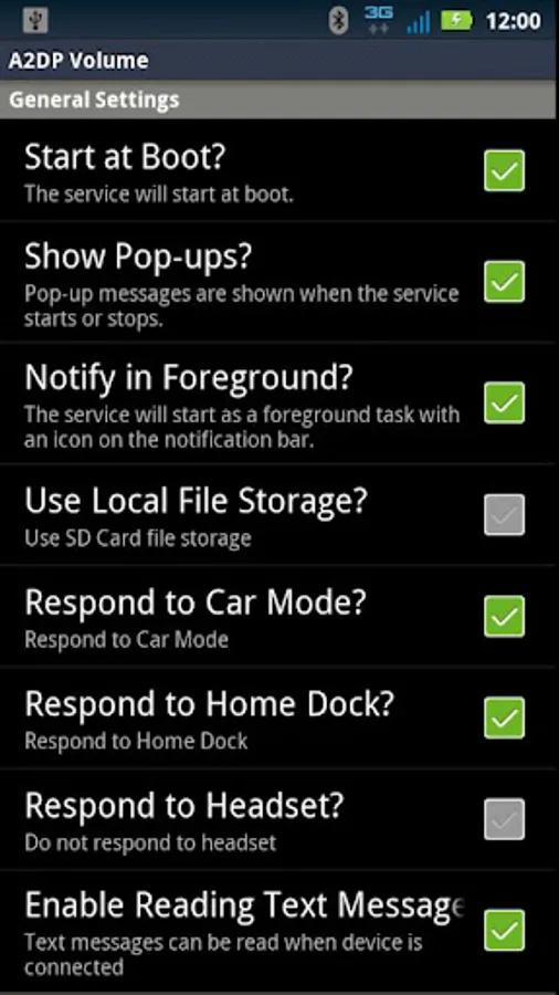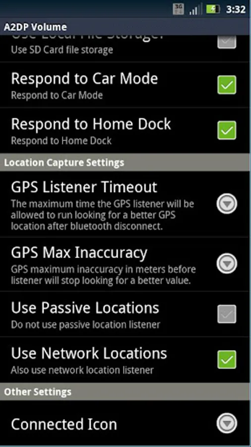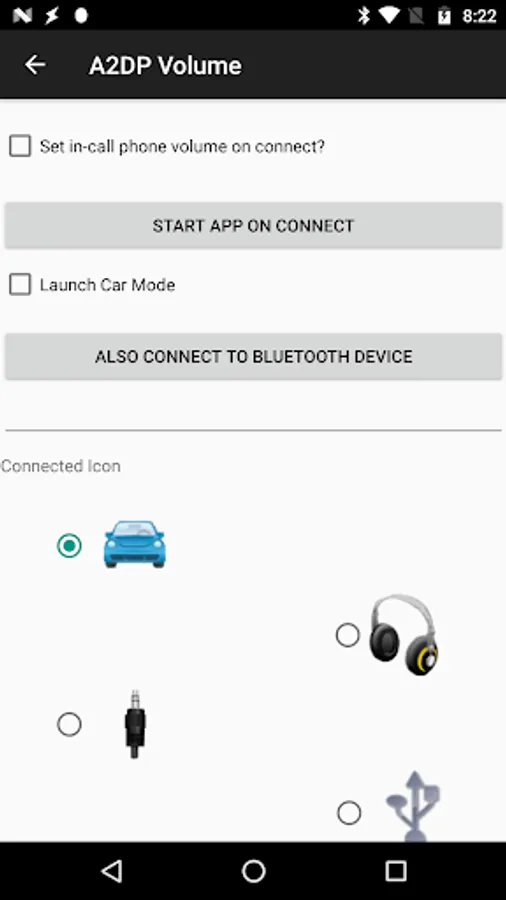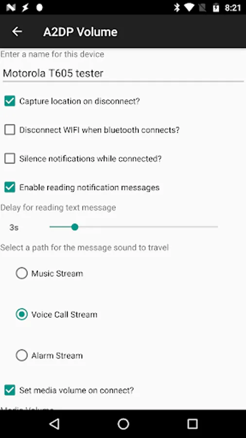 Automatically adjusts the media volume on Bluetooth connect and resets on Bluetooth disconnect. Automatically captures location information on disconnect so you can find where you left your car. Location can also be triggered when exiting car mode. Includes location widget to find your car. Can configure to also respond to home dock and audio jack as well. Each device is individually configured. Auto launch app or shortcut on connect. Auto connect another A2DP Bluetooth device after first device connects. Read out notification messages when connected to a device in the list using audio stream and Text To Speech services (see manual for details).