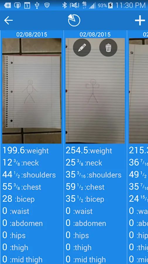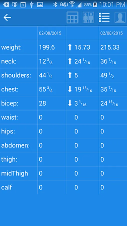 * Track any various measurements including weight, neck, shoulders, chest, bicep, waist, abdomen, hips, thigh, mid thigh, and calf.