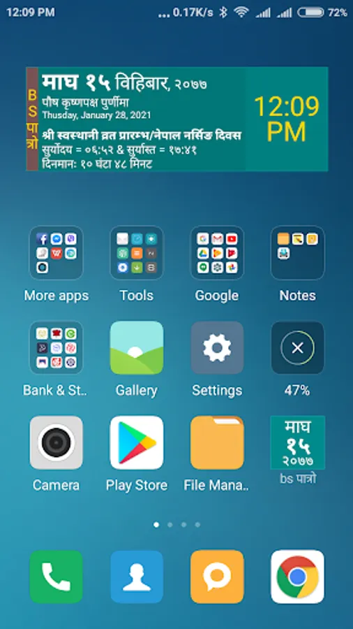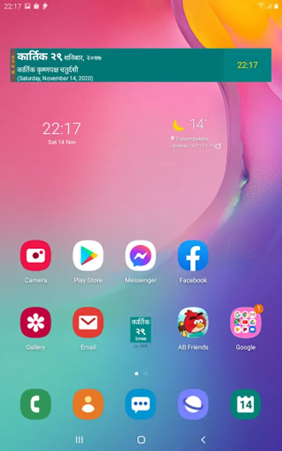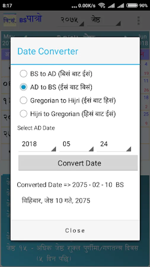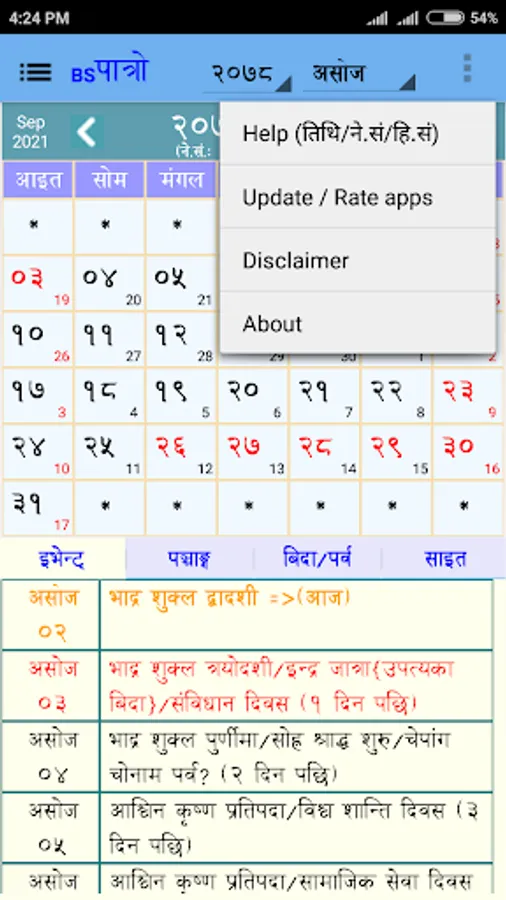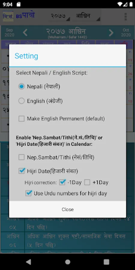 Beside BS and AD calendar, It also has provision to have one additional calendar either Hijri / Islamic Calendar(इस्लामिक कैलेंडर) or Nepal Sambat(नेपाल संबत) by enabling in setting.