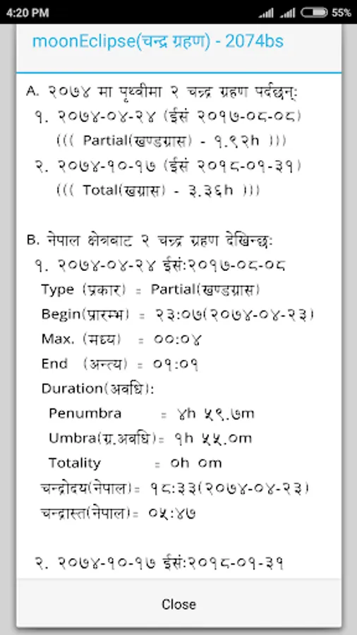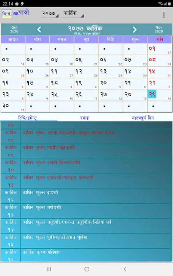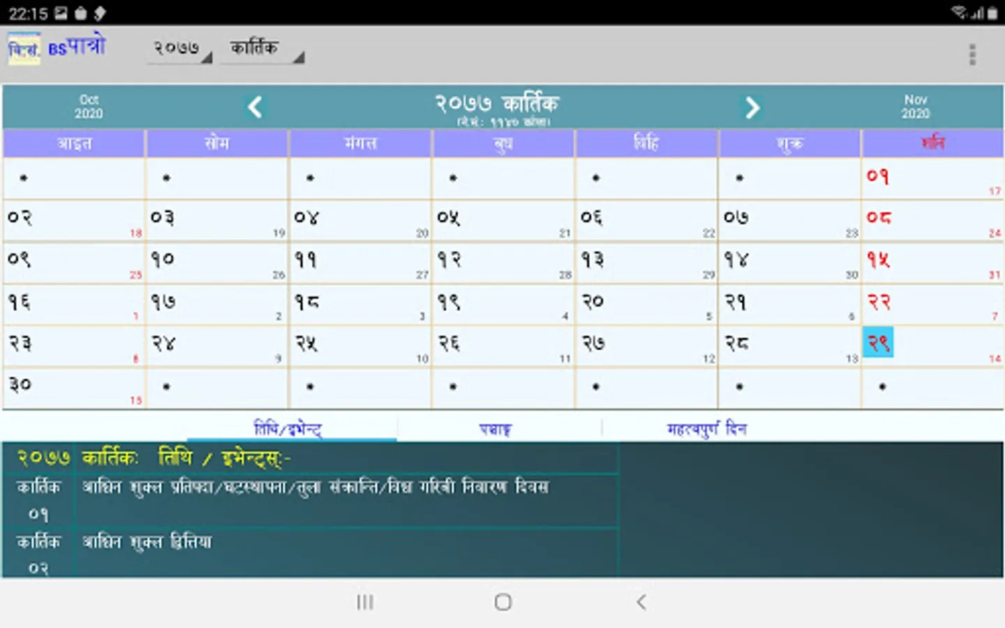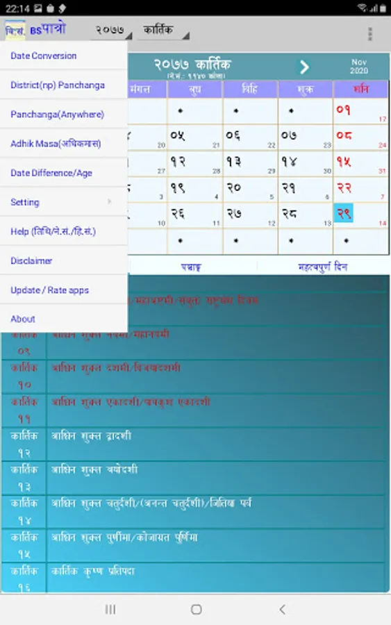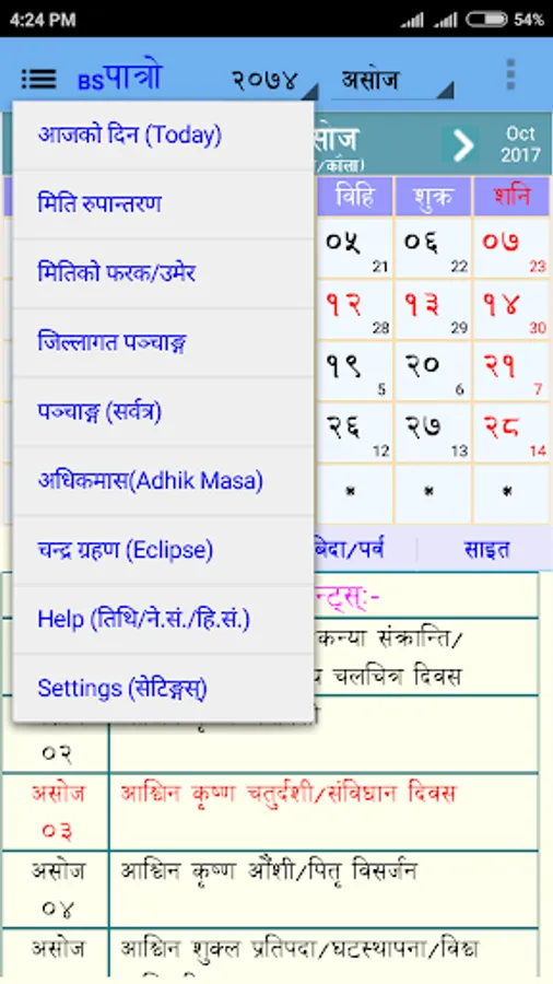 • Has provision to include Nepal Sambat (नेपाल संबत) by enabling it in setting menu.