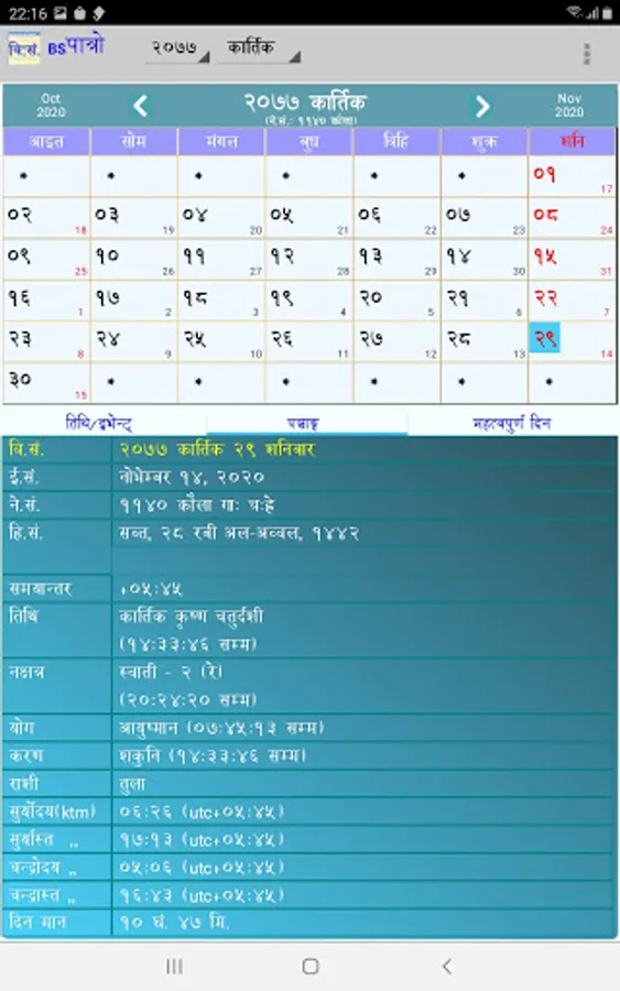 • Includes Panchanga(पञ्चाङ्ग), Tithi/Upcoming events, Holidays, Adhik Masa(अधिकमास) Information, Age(date difference) calculator.