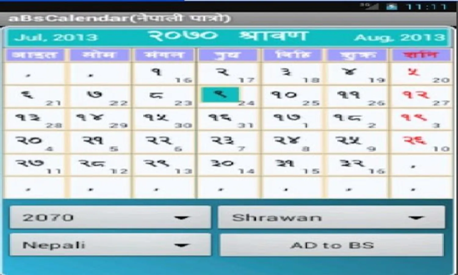 • Displays any selected month's calendar for BS year 1970 to 2100 (facilitates BS date to AD date conversion)