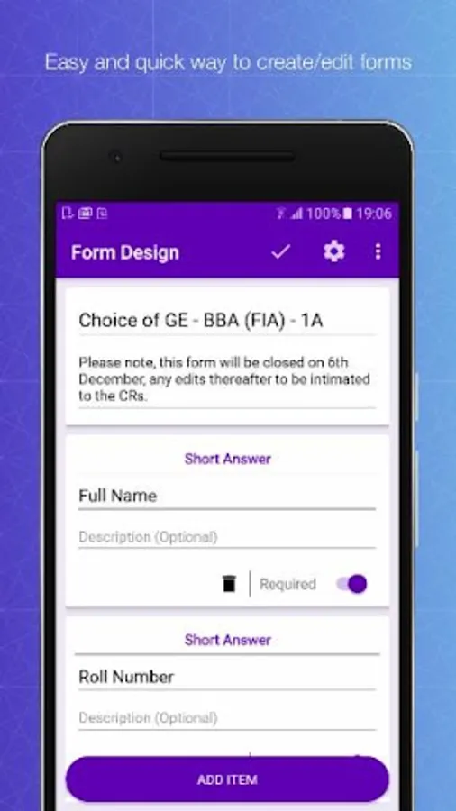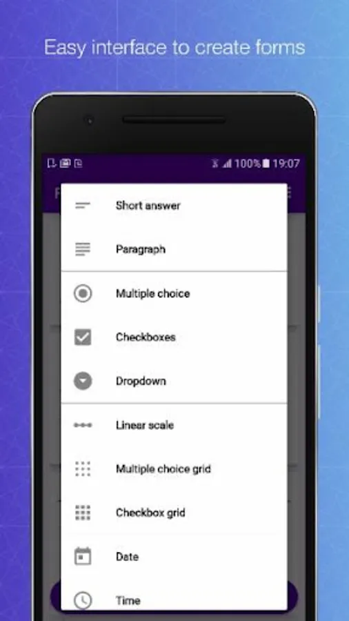 Create, edit and get responses for Google Form on your android phones and tablets via G-FormsApp for Google Forms. This is a 3rd party application and not an application from Google.