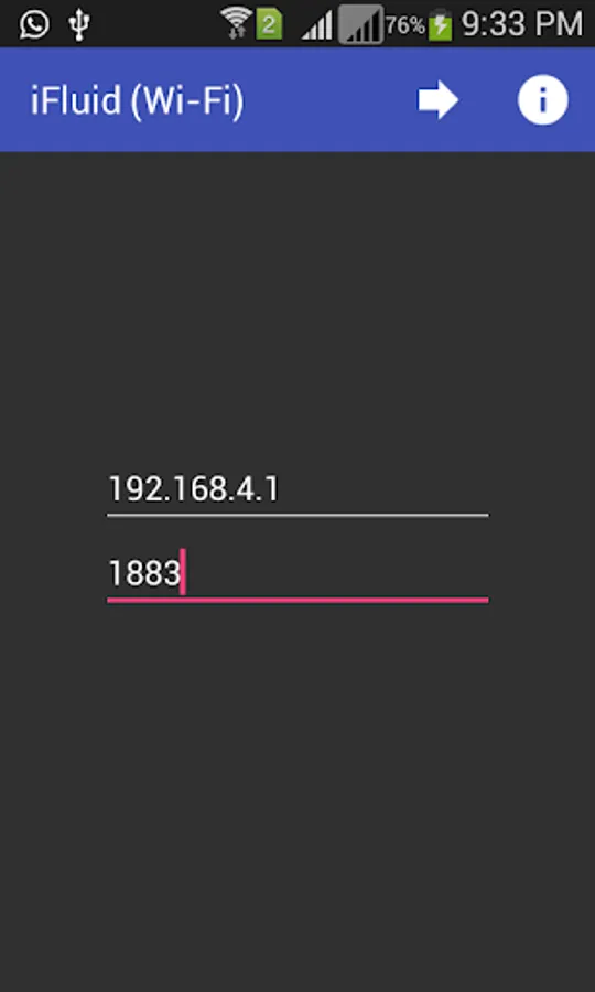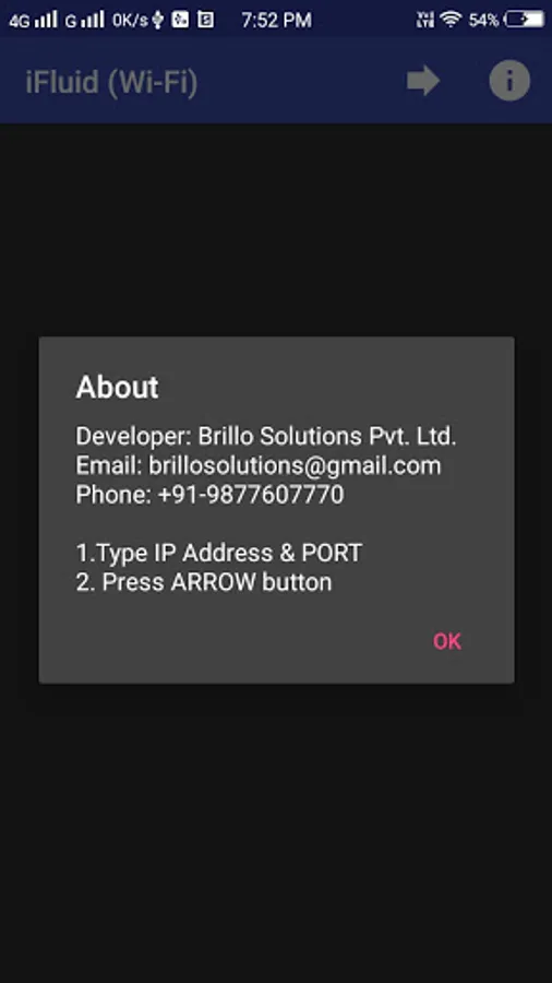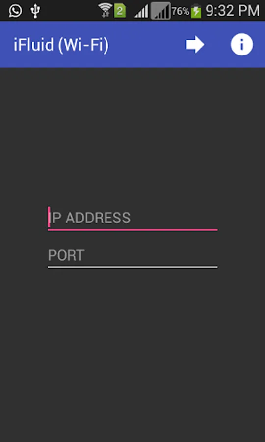 iFluid application requires your phone to be connected with Wi-Fi module. When you will start the application, it will demand IP ADDRESS and PORT number of Wi-Fi module that is supposed to be configured as server. For example, if we use ESP8266 as Wi-Fi module, follow its AT command set to make it as server. By default, static IP ADDRESS of ESP8266 is 192.168.4.1 and you can fix PORT number as per your desire.