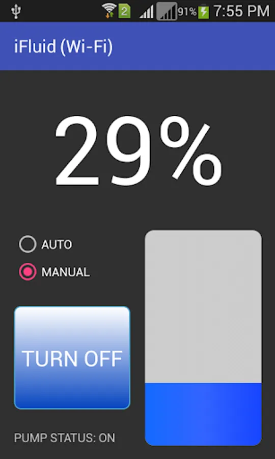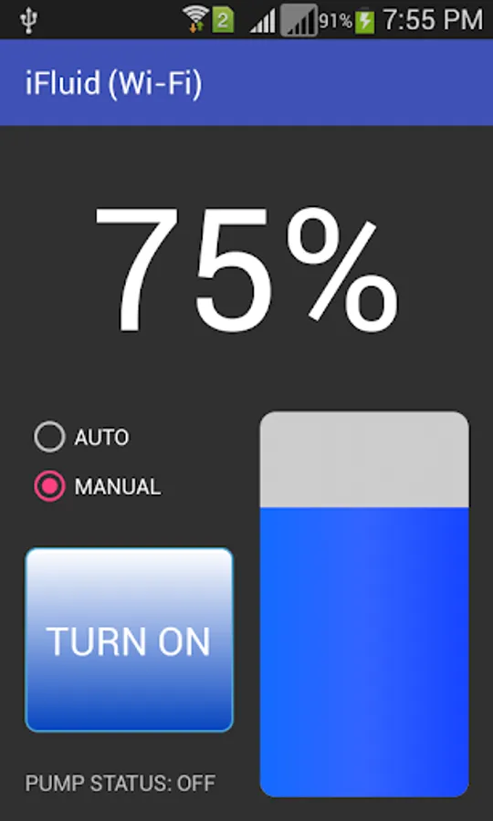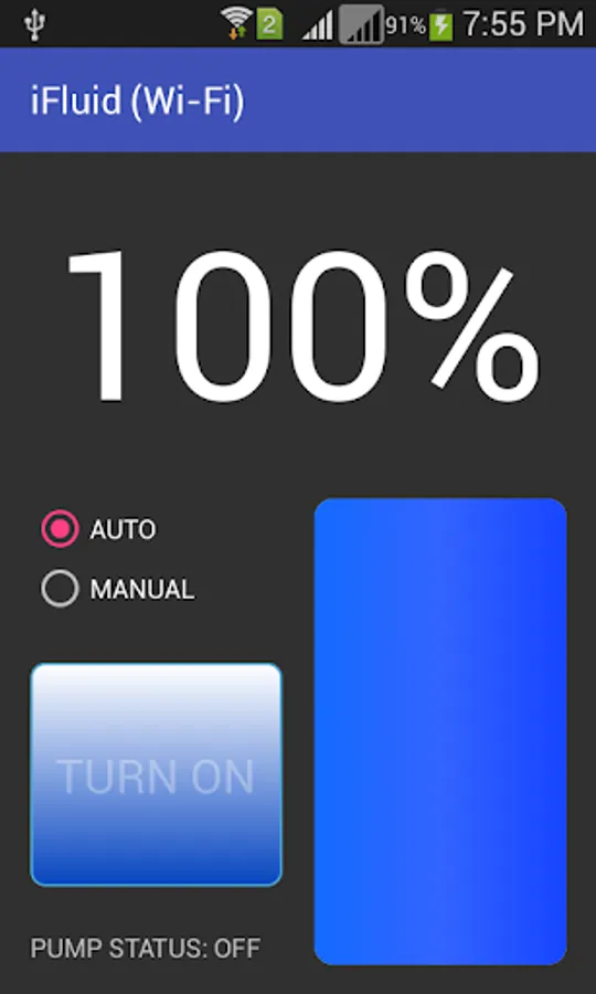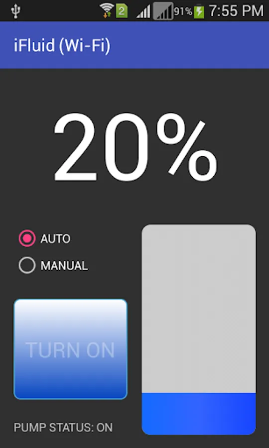 If you select AUTO mode, application will keep the pump ON if fluid level is less than 100%, else it will turn OFF the pump if fluid level reached 100%.
