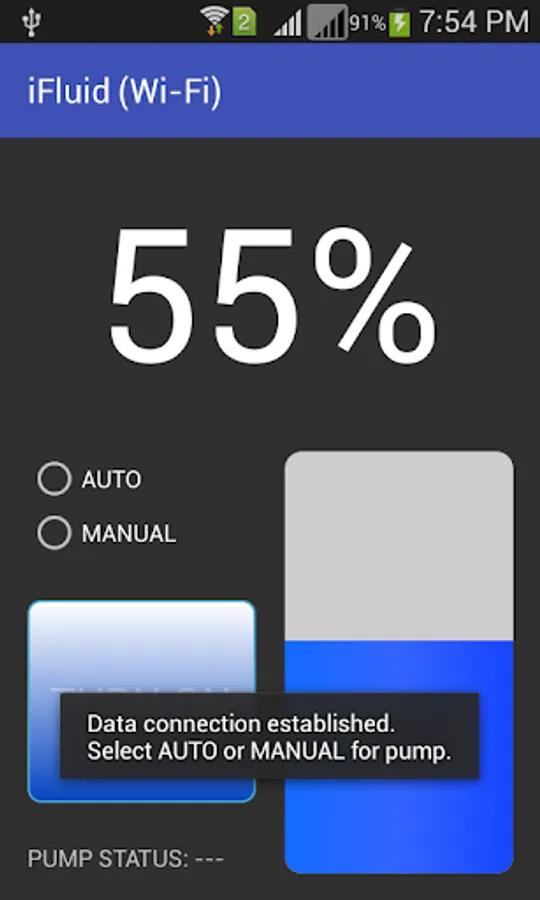 After that, application will take half of the second to establish an active data connection between itself and Wi-Fi module. As soon as it establish the connection with Wi-Fi module, you need to select the AUTO or MANUAL mode to either turn ON/OFF the pump in automatic or manual way.