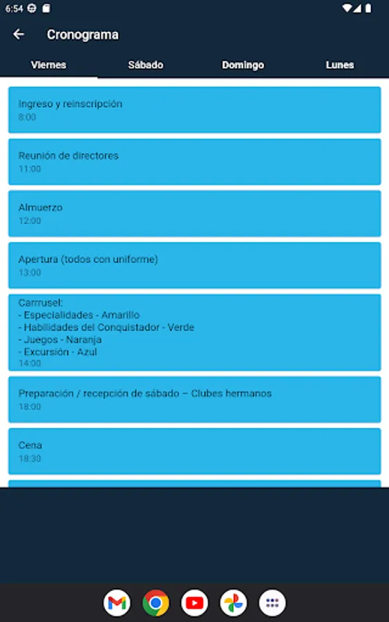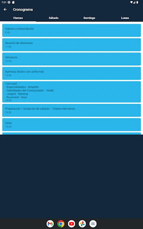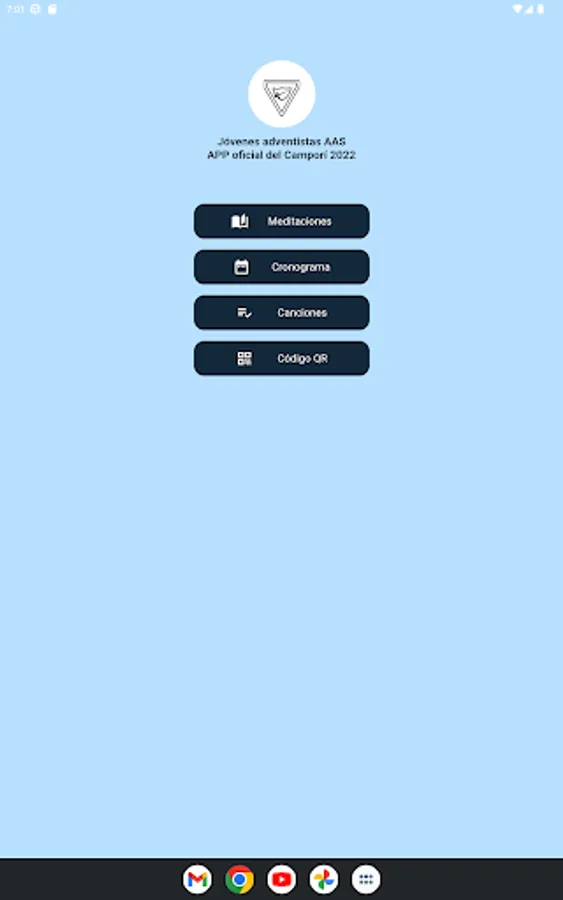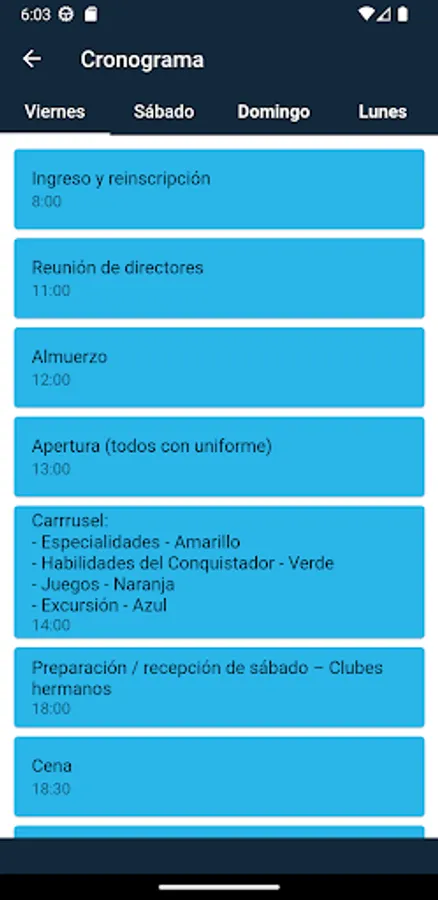 The main objective of this app is to ensure that each participant has information corresponding to their activities as a club in the event; taking into account the schedules, meeting places and the addition and subtraction of points. At the same time, the app will have a QR code scanner that will serve to relax the conquerors and leaders, they will be able to enjoy, in their free moments, and if they wish, the search for QR codes distributed throughout of the entire property; in them you will be able to find information related to the Pathfinder club and biblical quotes that will help you in your spiritual part. And based on the spiritual aspect, each participant will have daily meditations that can be found in the same app; as well as daily verses that will help them throughout the event and after it.