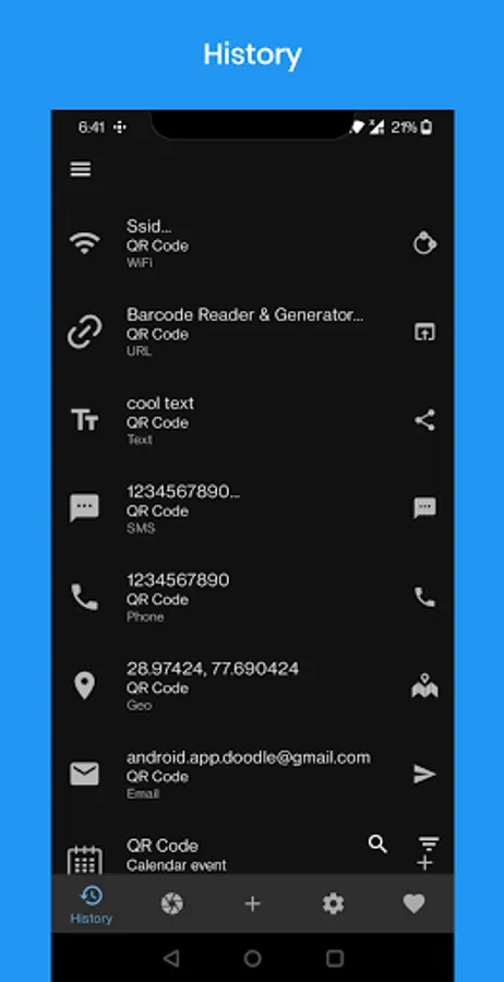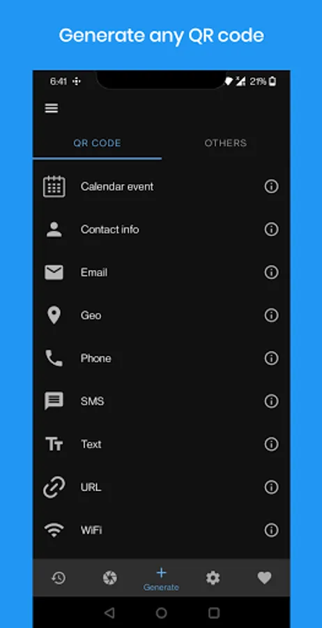 URL, Contact information (VCARD, etc.), Calendar event, Email, Phone, SMS, Wi-Fi, Geo-location (latitude and longitude)