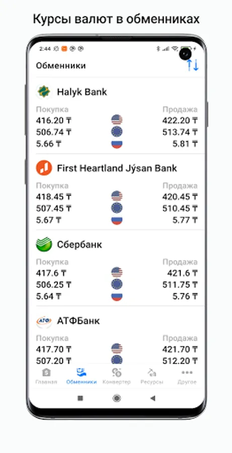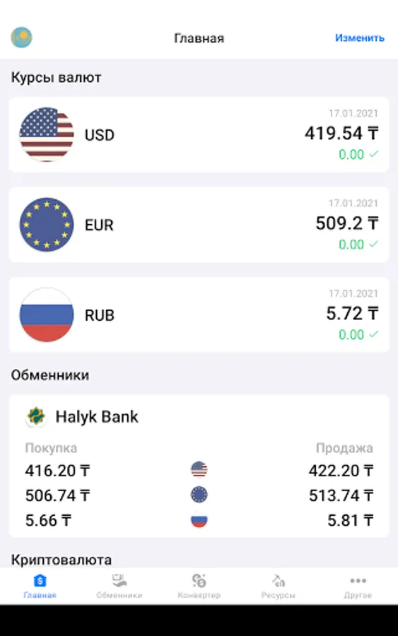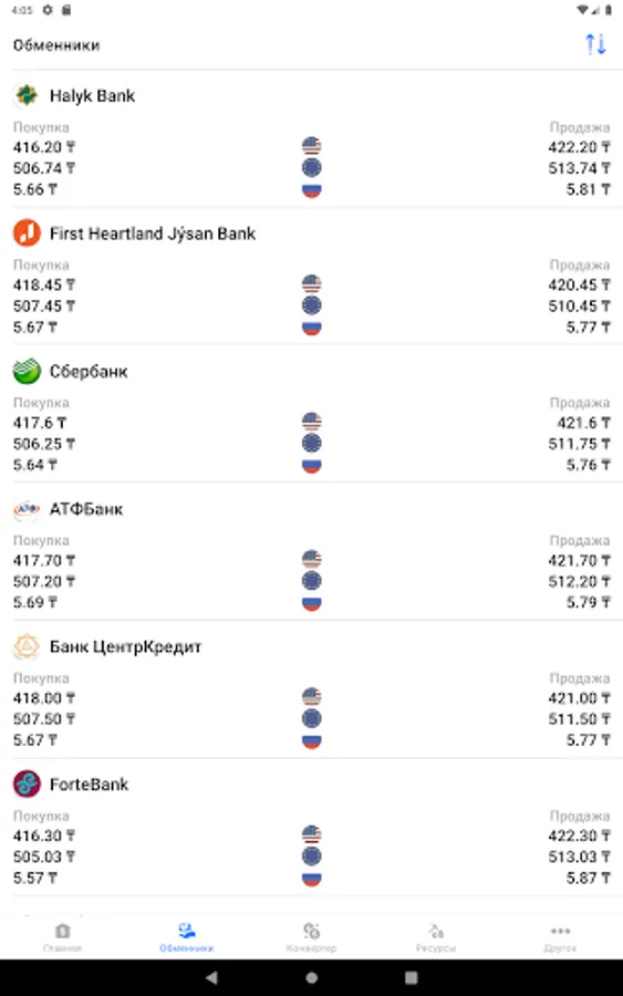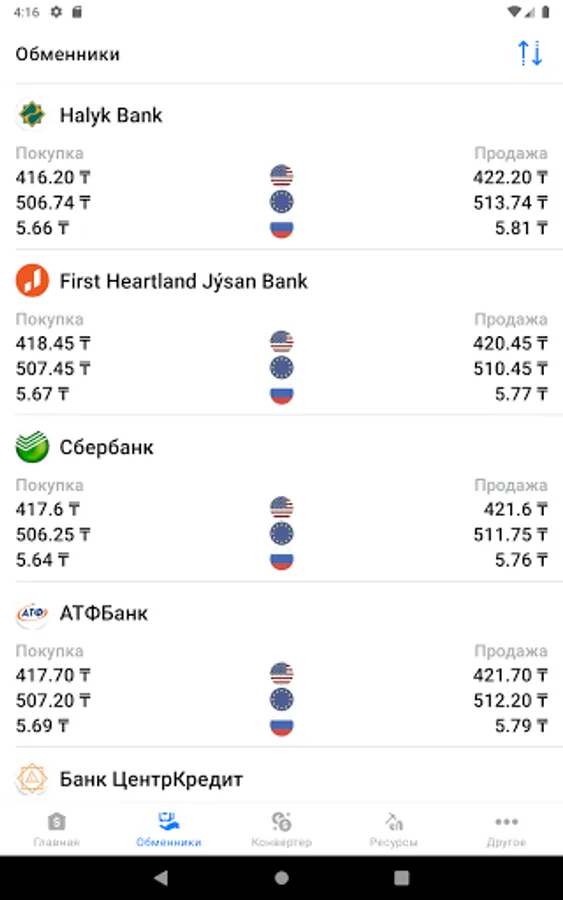 - Rates for buying and selling currencies in exchangers (Halyk Bank, First Heartland Jýsan Bank, Sberbank, Bank CenterCredit, Bank RBK, ForteBank, Kaspi Bank, Home Credit Bank, Eurasian Bank, Nurbank, Alfa-Bank, Altyn Bank, Bank of China in Kazakhstan , VTB Bank, Freedom Finance Bank, KZI Bank, Shinhan Bank Kazakhstan, Zaman-Bank, Kazpost, MiG, Som Exchange Almaty)