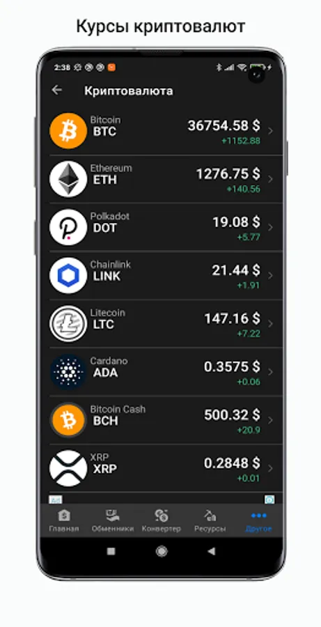 - Cryptocurrency rate (Bitcoin, Ethereum, Litecoin, Ripple, Cardano, Binance Coin, Terra, Chainlink, Solana, Polkadot, Dogecoin, Shiba Inu and many others)