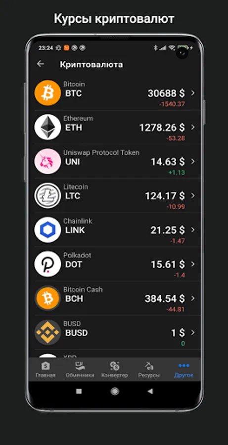 - Cryptocurrency rate (Bitcoin, Ethereum, Litecoin, Ripple, Cardano, Binance Coin, Terra, Chainlink, Solana, Polkadot, Dogecoin, Shiba Inu and many others)