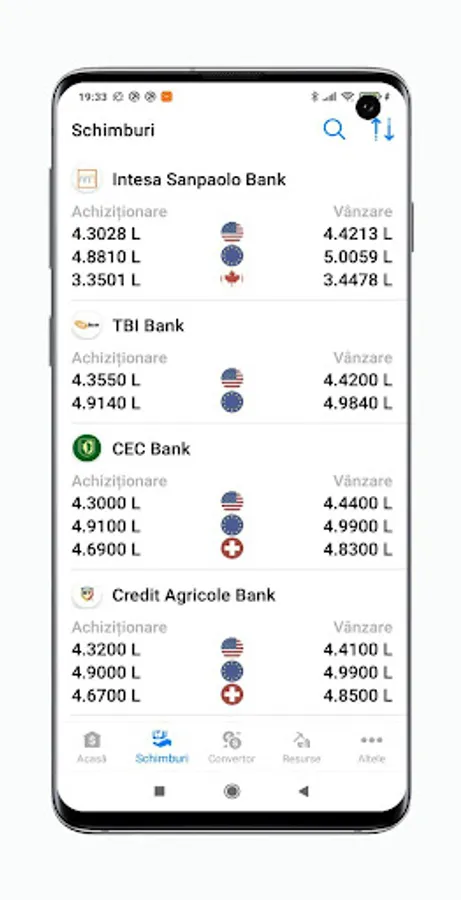 - Rates for buying and selling currencies in exchangers (ING Bank, Credit Agricole Bank, Patria Bank, ProCredit Bank, BRCI, Credit Europe Bank, Intesa Sanpaolo Bank, TBI Bank, First Bank, BRD, Idea Bank, Libra Internet Bank, EximBank, Banca Româneasca, CEC Bank, Banca Transilvania, BCR)