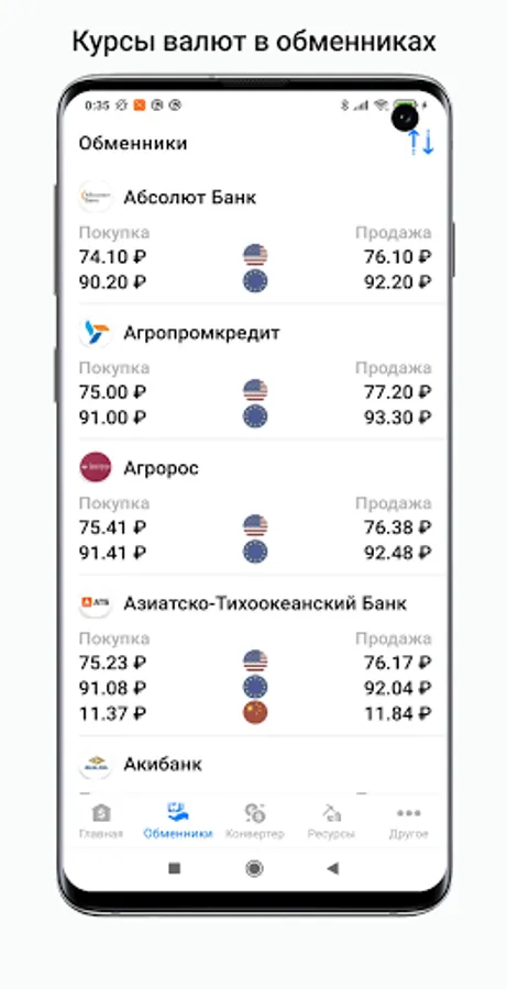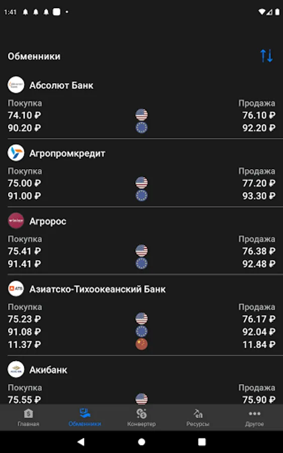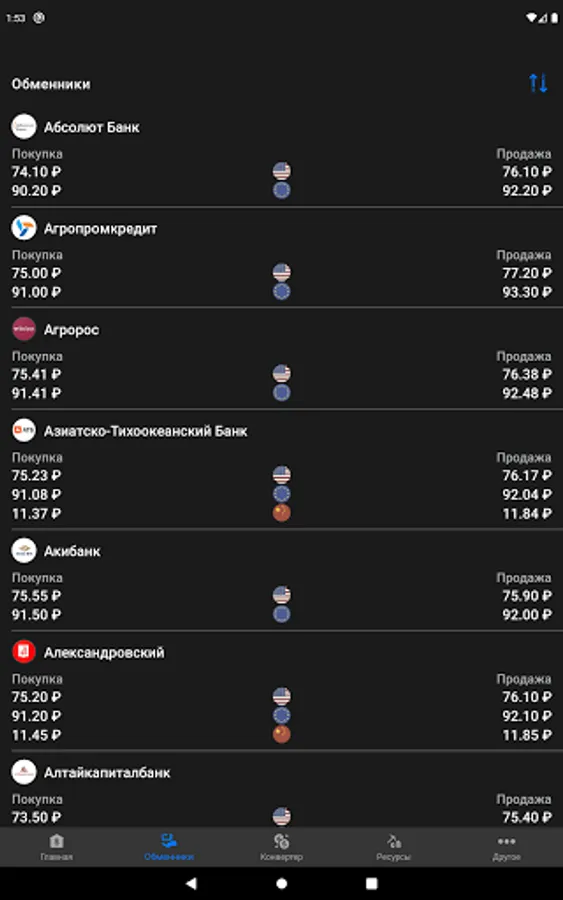 - Rates for buying and selling currencies in exchangers (Sberbank, Alfa-Bank, Bank Saint Petersburg, Vesta, Uralsib, BCS Bank JSC, Fora-Bank, Zenit Bank, NS Bank, Agroros, Investtorgbank, Solidarity (Moscow) , Raiffeisenbank, Loco-Bank, Promsvyazbank, Moscow Credit Bank, Asia-Pacific Bank, Otkritie Bank, MOSOBLBANK PJSC, Genbank, Orange Bank, Interprogressbank, Russian Agricultural Bank, UniCredit Bank JSC, MinBank PJSC, Bank DOM.RF JSC ”, SMP Bank, Tavrichesky Bank, TransKapitalBank, Rosbank, Sarovbusinessbank, Post Bank, SBI Bank, Energotransbank, Lanta-Bank, Absolut Bank, Rosgosstrakh Bank, Novikombank, Uglemetbank, Podem Bank!, Surgutneftegazbank, Gaztransbank, Energobank, Sovcombank, Prio-Vneshtorgbank, Agropromcredit, KamchatProfitBank, Sea Bank, Primsotsbank, Plus Bank, BystroBank, Norvik Bank, Tinkoff Bank, Russian Standard Bank, Chelindbank, Kuban Credit, Alexandrovsky, Koshelev-Bank, ChBRR Bank JSC, PromTransBank, Ekonombank , Finam Bank, Realist Bank, BBR Bank, Sibso Central Bank, Zhivago Bank, SKB-Bank, Globus Bank, Chelyabinvestbank, SOYUZ Bank, Altaikapitalbank, Tomskpromstroybank, Primorye Bank, Timer Bank, Akibank, Center-invest, Levoberezhny Bank, J&T Bank, Vneshfinbank, VTB Bank, Vostochny Bank , Gazprombank)