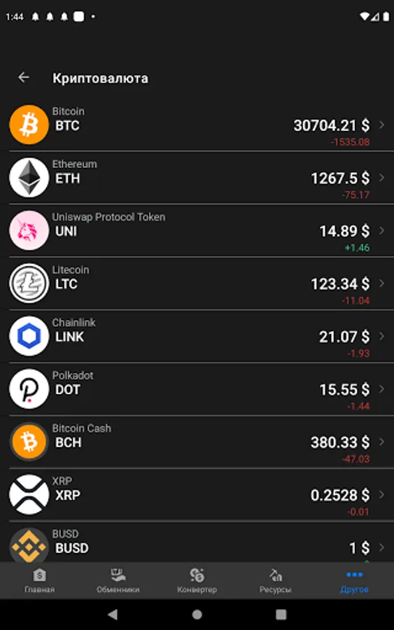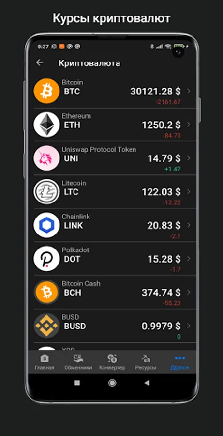 - Cryptocurrency rate (Bitcoin, Ethereum, Litecoin, Ripple, Cardano, Binance Coin, Terra, Chainlink, Solana, Polkadot, Dogecoin, Shiba Inu and many others)