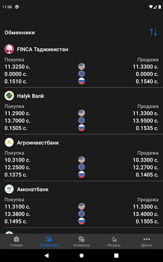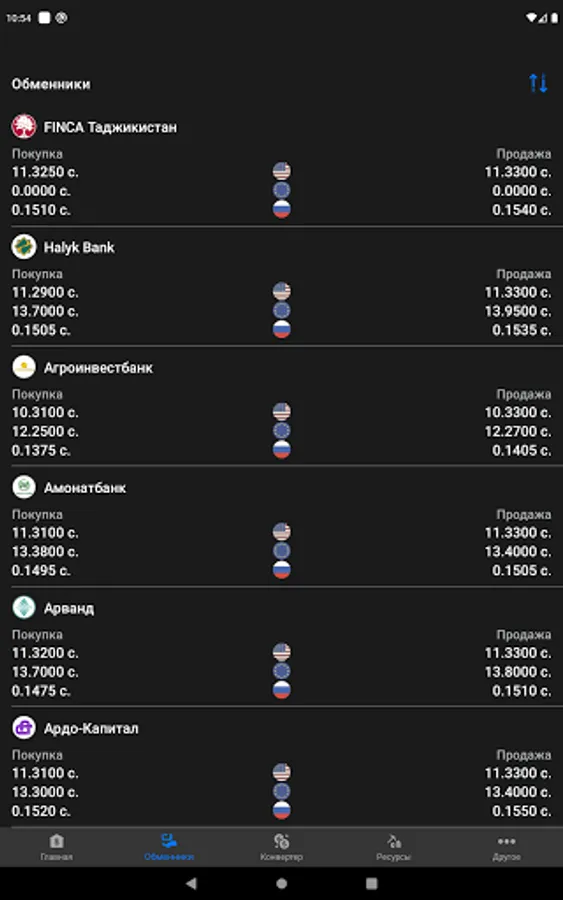 - Rates for buying and selling currencies in exchangers (Humo, Ardo-Capital, FINCA Tajikistan, First Microfinance Bank, Kafolatbank, Asia Bank, FAZO S, IMON INTERNATIONAL, Spitamen Bank, Tavhidbank, Halyk Bank, Amonatbank, Eskhata Bank, International Bank of Tajikistan, Commerce Bank of Tajikistan, OJSC "Orienbank")