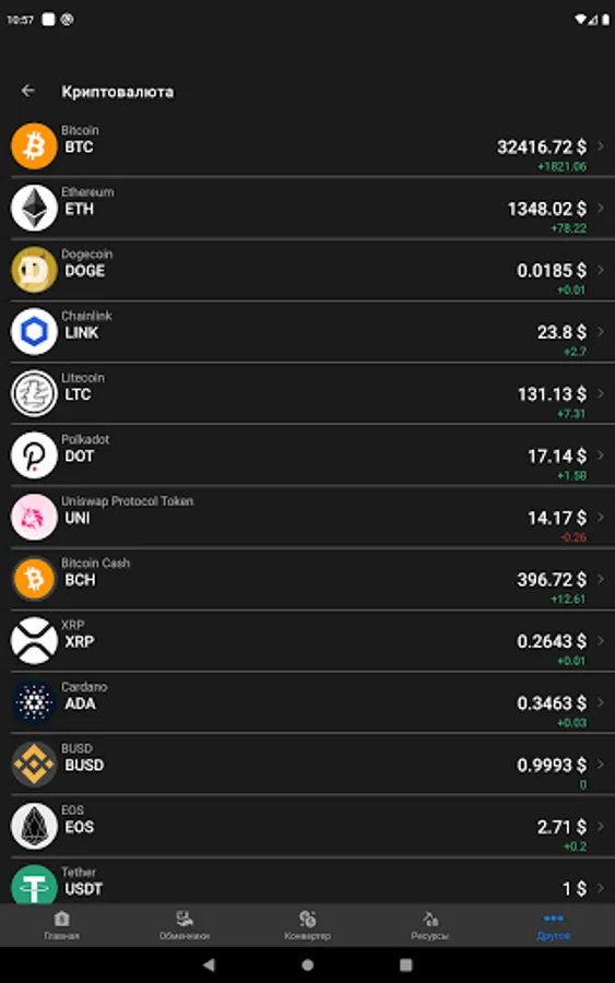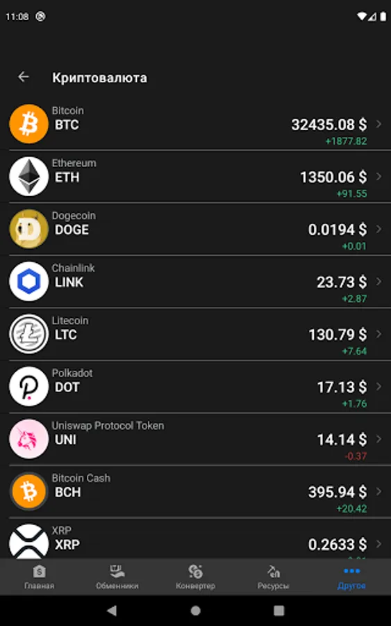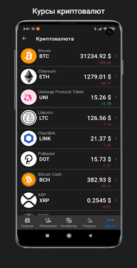 - Cryptocurrency rate (Bitcoin, Ethereum, Litecoin, Ripple, Cardano, Binance Coin, Terra, Chainlink, Solana, Polkadot, Dogecoin, Shiba Inu and many others)
