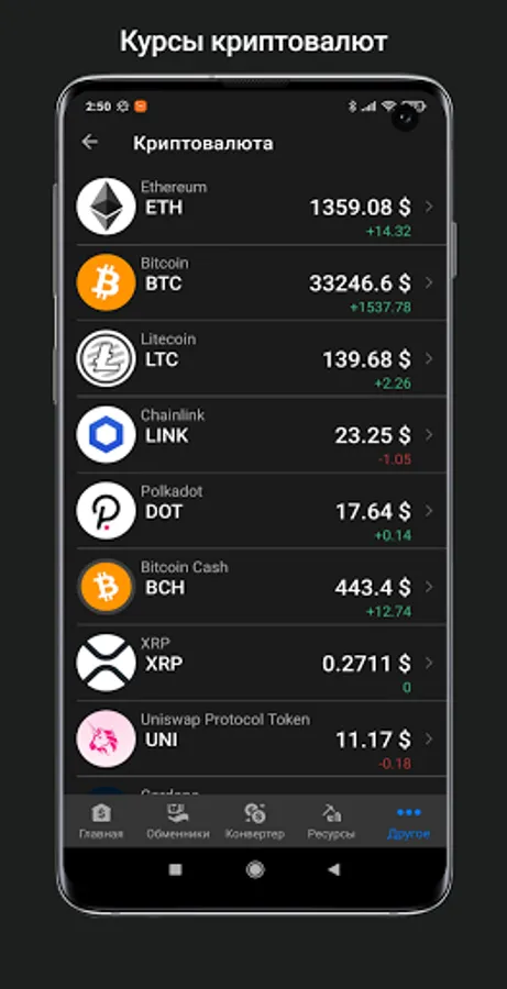 - Cryptocurrency rate (Bitcoin, Ethereum, Litecoin, Ripple, Cardano, Binance Coin, Terra, Chainlink, Solana, Polkadot, Dogecoin, Shiba Inu and many others)