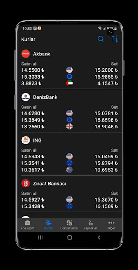 - Exchange rates for buying and selling currencies in exchangers (Akbank, DenizBank, ING, Ziraat Bankası, Anadolubank, Alternatif Bank, Bank Mellat Turkey, Türkiye İş Bankası, Halk Bankası, Burgan Bank, Yapi Kredi, Fibabanka, Garanti Bankası, ICBC Turkey, QNB Finansbank , Dealer Yatırım, A&T BANK)