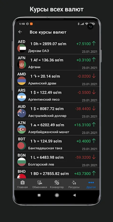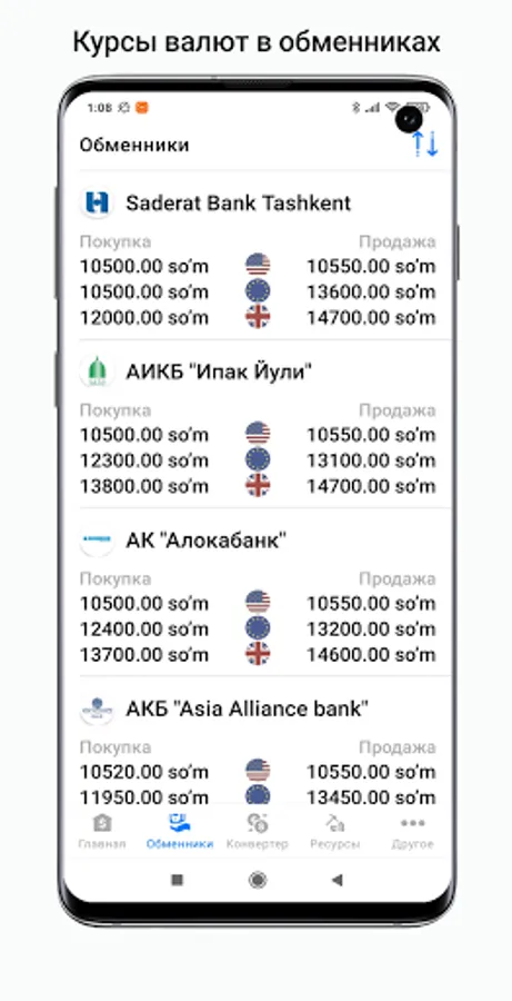 - Rates for buying and selling currencies in exchangers (ANOR BANK, National Bank of Uzbekistan, Qishloq Qurilish Bank, Ipak Yo'li bank, Universal bank, Tenge Bank, Invest Finance Bank, Agrobank, Orient Finans bank, Hamkorbank, Turonbank, Ravnaq-bank , Saderat Bank Tashkent, KDB Bank Uzbekistan, JSCB "Microcreditbank", Savdogar bank, Kapitalbank, Asia Alliance Bank, Trustbank, Turkiston Bank, Davr Bank, Ziraat Bank Uzbekistan, Xalq bank, Ipoteka-bank, Poytaxt Bank, SANOAT QURILISH BANK, Asakabank , Madad Invest Bank)