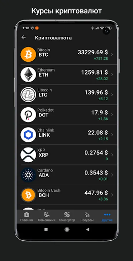 - Cryptocurrency rate (Bitcoin, Ethereum, Litecoin, Ripple, Cardano, Binance Coin, Terra, Chainlink, Solana, Polkadot, Dogecoin, Shiba Inu and many others)