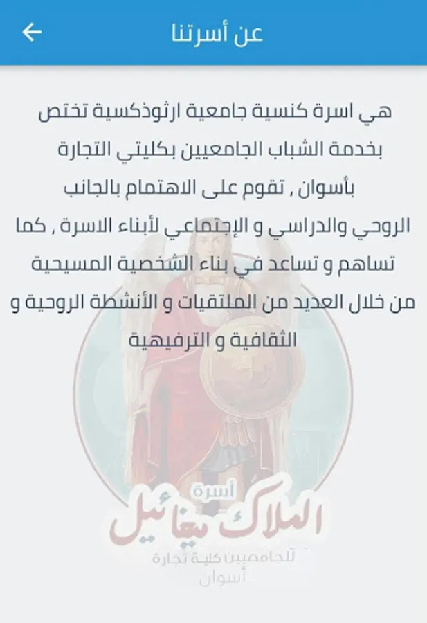 It is an Orthodox university church family that specializes in serving university youth at the Faculty of Commerce in Aswan. It is based on caring for the spiritual, academic and social aspect of the family's children. It also contributes and helps build the Christian personality through many spiritual, cultural and entertainment forums and activities.