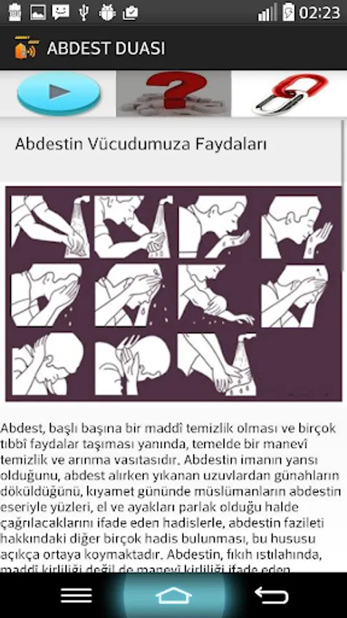 To pray, to keep the Koran, etc. ablution is necessary to do some prayers. There are prayers to be read while ablution which was transferred to us from our ancestors righteous. They are beautiful to read (müstehab) was observed. With this application you can listen to the prayers always without internet and you can memorize the time. In addition, there are known benefits of ablution them;
