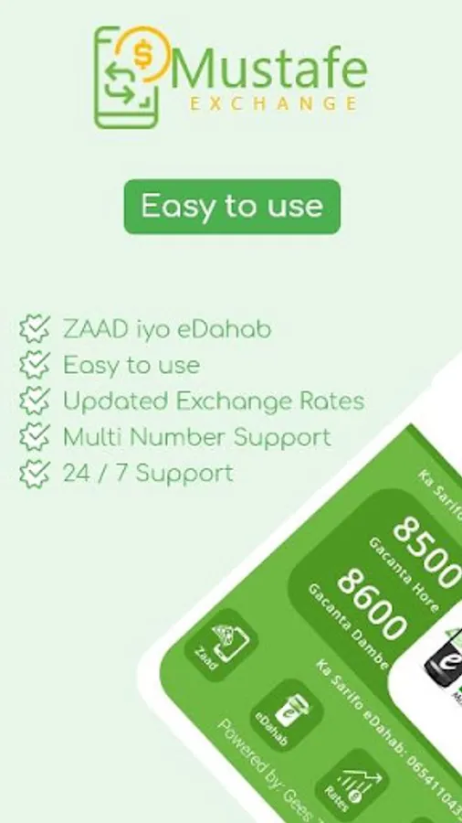 Mustafe Money exchange waa adeeg Mobile App kuu sahlaya in aad si fudud u sarifato lacagtaadda.