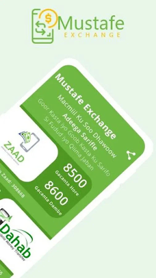 Mustafe is a Mobile App Money Exchange Service you can easily Exchange your Somaliland Shiling to USD through Zaad and eDahab.