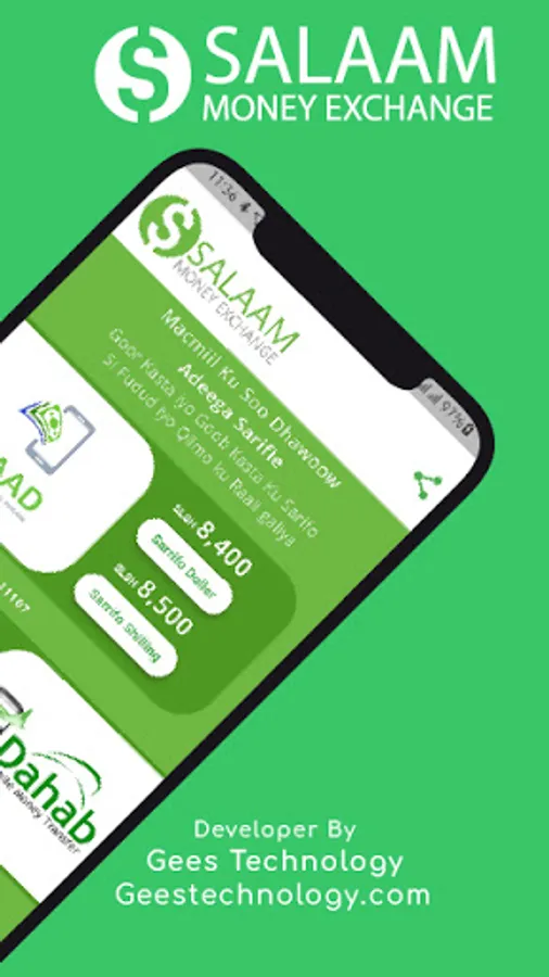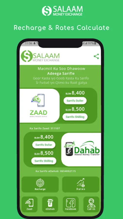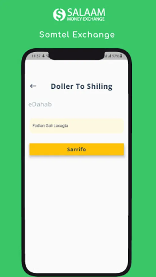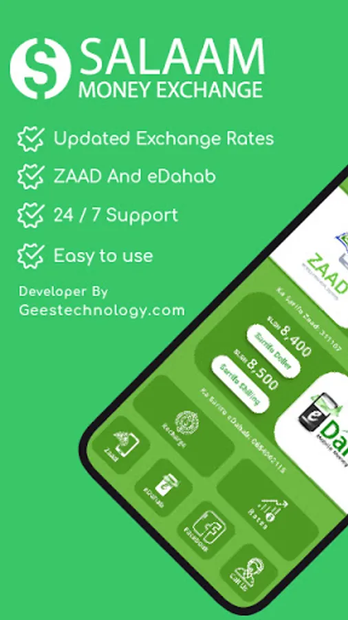 Salaam is a Mobile App Money Exchange Service you can easily Exchange your Somaliland Shiling to USD through Zaad and eDahab.