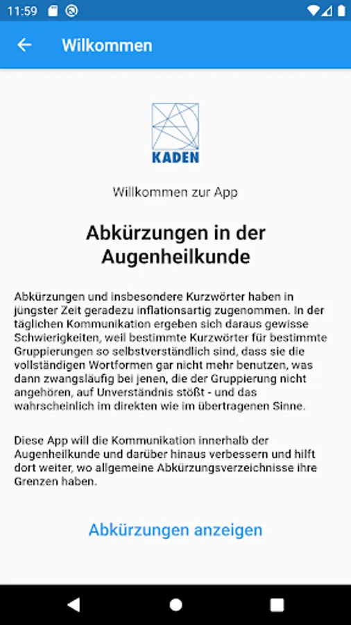 This app from the renowned Kaden Verlag explains the meaning of over 2700 abbreviations in ophthalmology. An index and a search function can be used to search specifically for abbreviations. Marked favorites are synchronized between iPhone & iPad via iCloud. The automatic update ensures that the abbreviations are always up to date - so you always receive all updates for new terms directly, lifelong and free of charge.